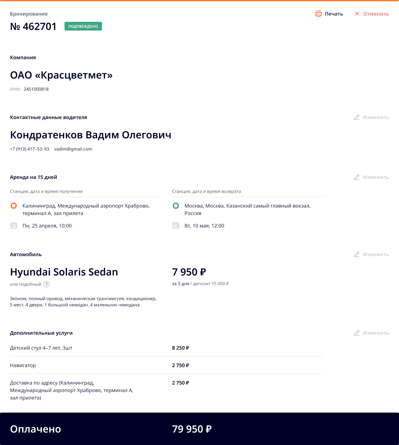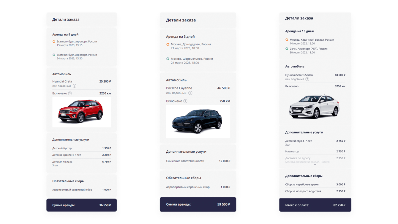 В деталях заказа мы отразили все суммы и предупреждения о возможных доплатах, например, при превышении базового километража. Финальную стоимость выделили ярким цветом и отдельным блоком — чтобы клиент точно обратил на нее внимание.