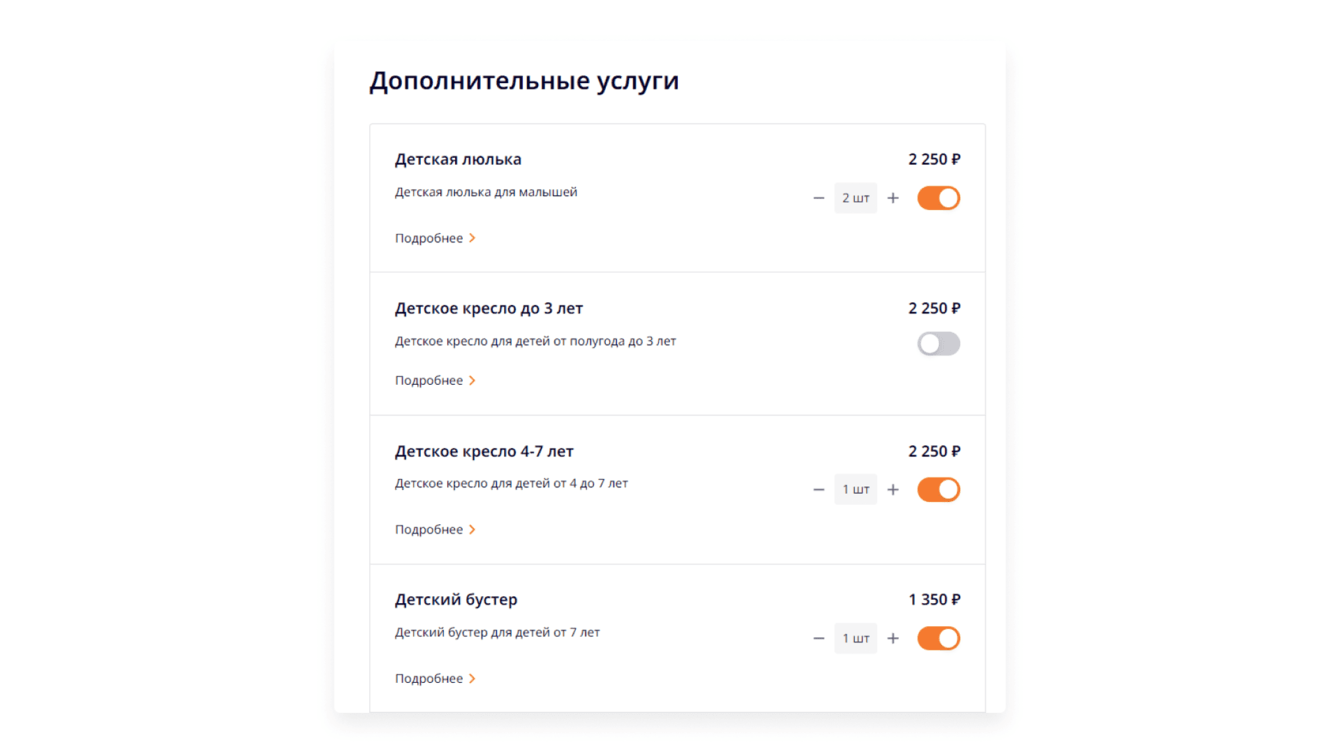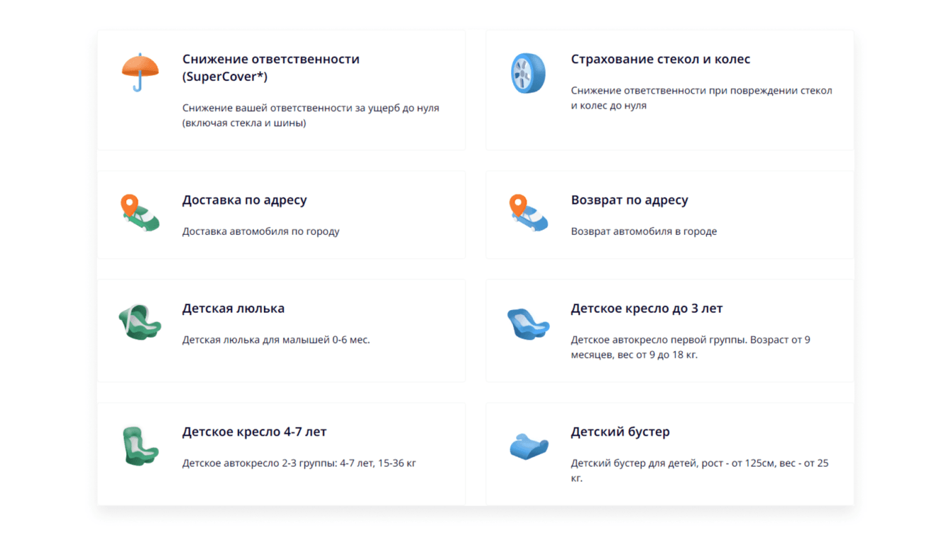 Для комфортной поездки RentMotors предлагает клиентам выбрать дополнительные опции, перечень которых мы выводим на одном из этапов бронирования.