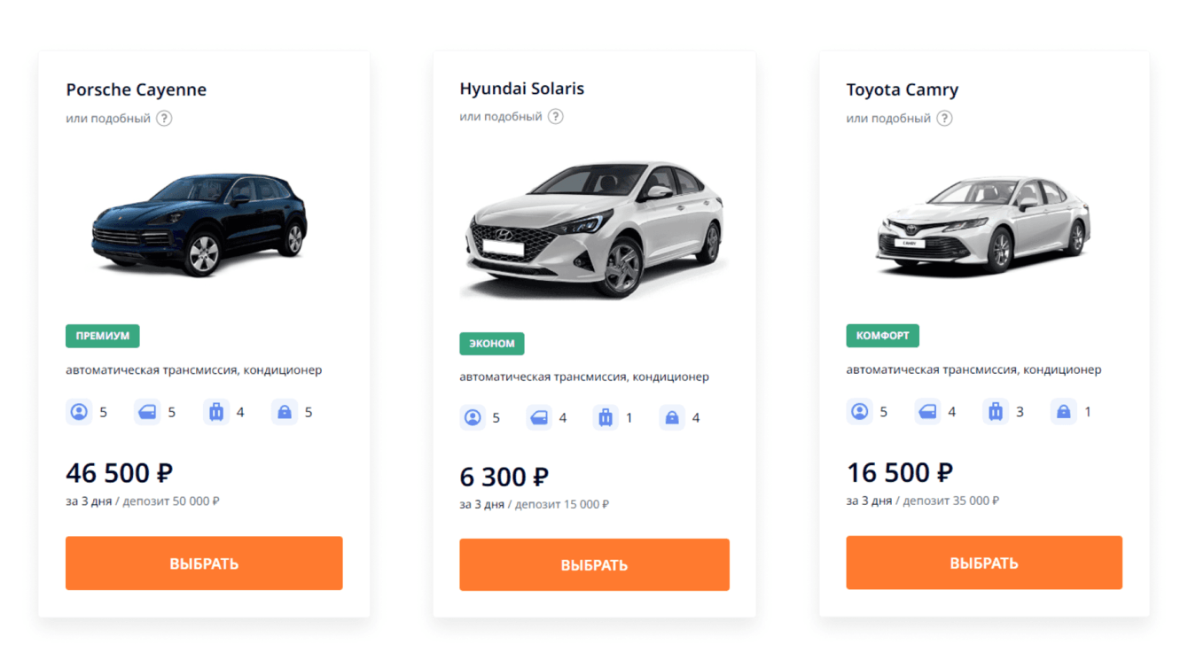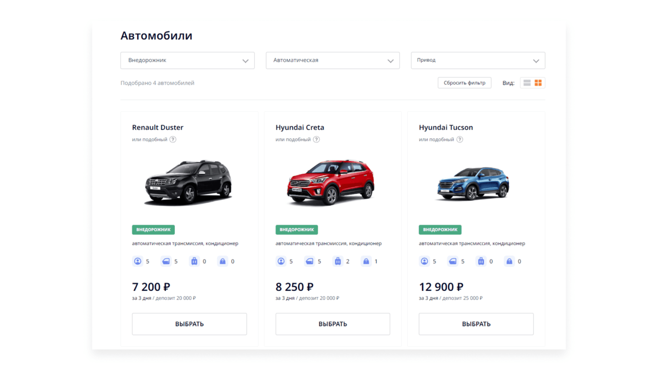 Эти критерии помогают на первом шаге отфильтровать автомобили, открытые к бронированию. Подборку с каталогом свободных машин система выводит на следующем шаге.