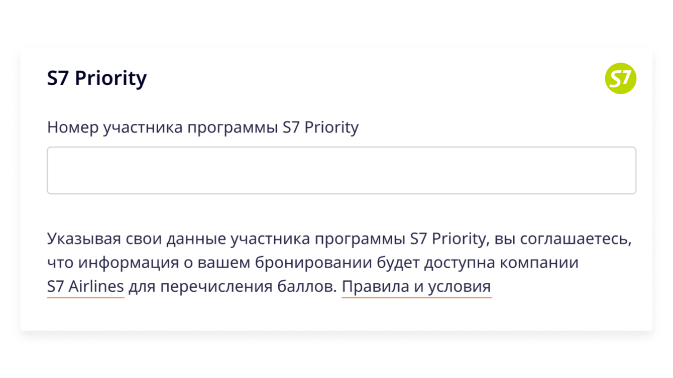 Еще один сценарий бронирования разработан специально для партнерки S7 — участники программы S7 Priority получают мили за использование сервиса. Для начисления бонусов информация о заказе передается авиакомпании.