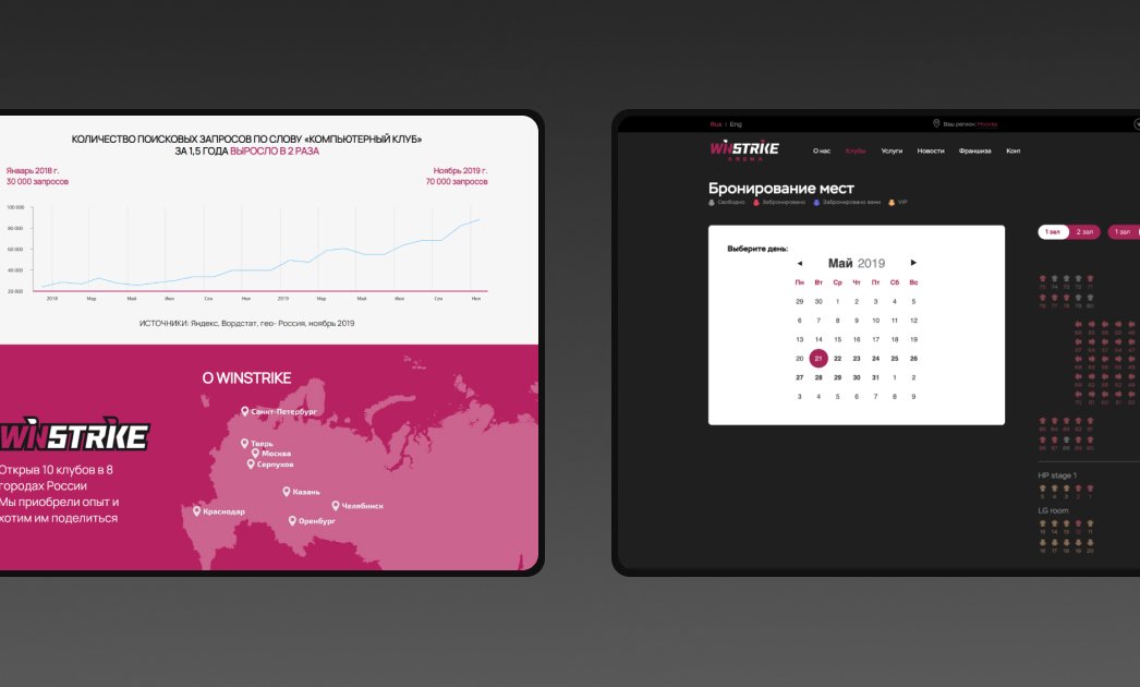 Для Winstrike было важно обеспечить пользователям возможность бронирования компьютеров в клубах за минимальное количество кликов. Мы разработали сайт и мобильное приложение, на котором реализовали этот процесс без каких-либо регистраций: вход осуществляется по номеру телефона, через социальные сети или игровую платформу Steam, которую ежемесячно используют 120 миллионов человек.