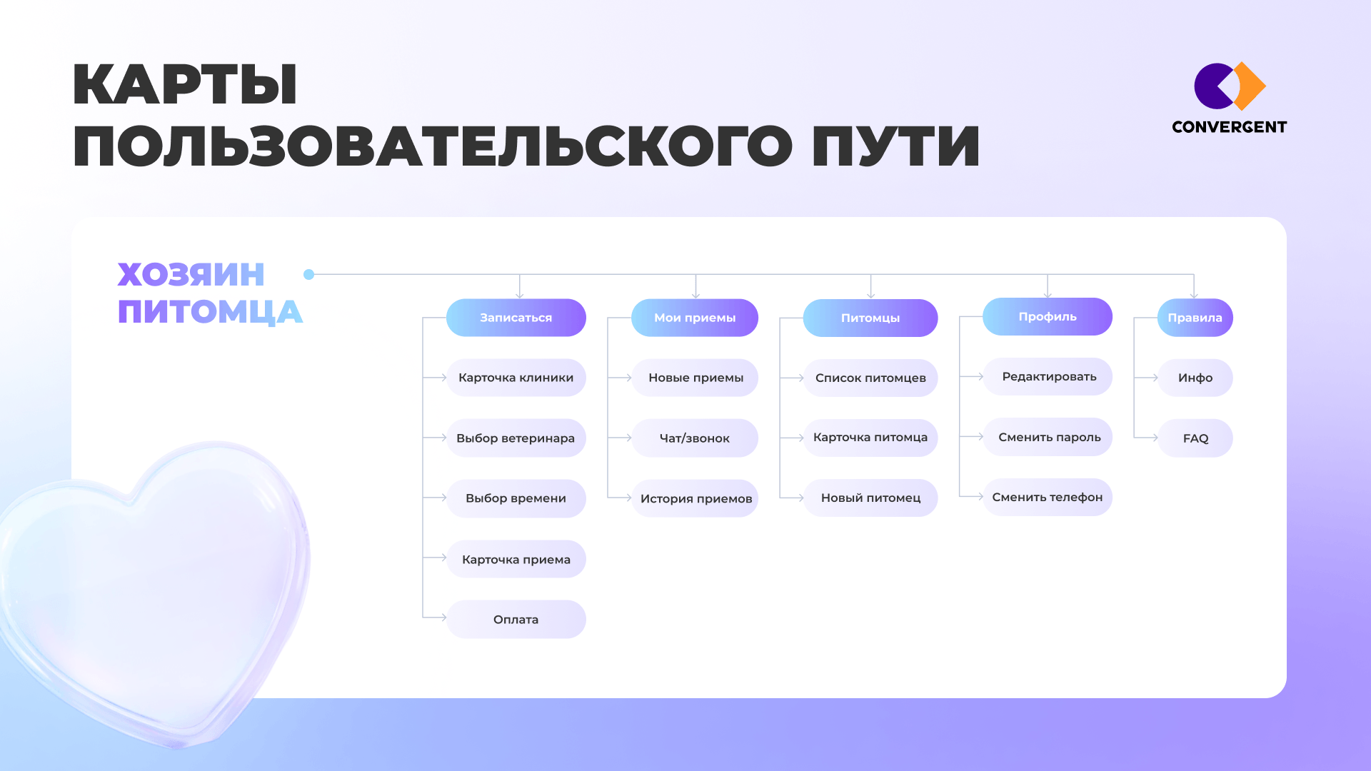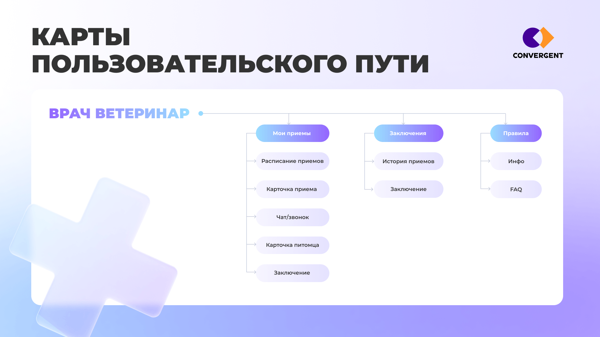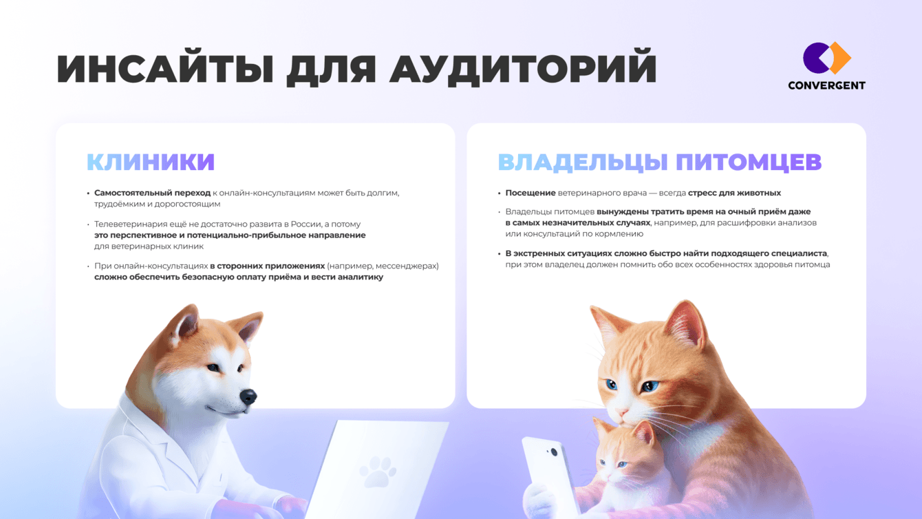 С одной стороны, сервис должен был решать запросы клиник, с другой — закрывать потребности владельцев питомцев. Поэтому первым делом мы выделили основные инсайты для двух групп аудитории.