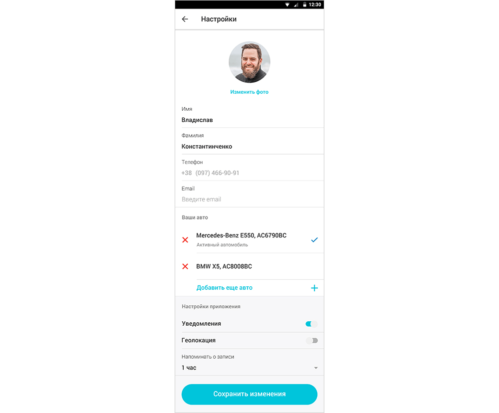 Личные данные и настройки приложения пользователь может изменить на экране «Настройки». Здесь же можно добавить больше автомобилей.
