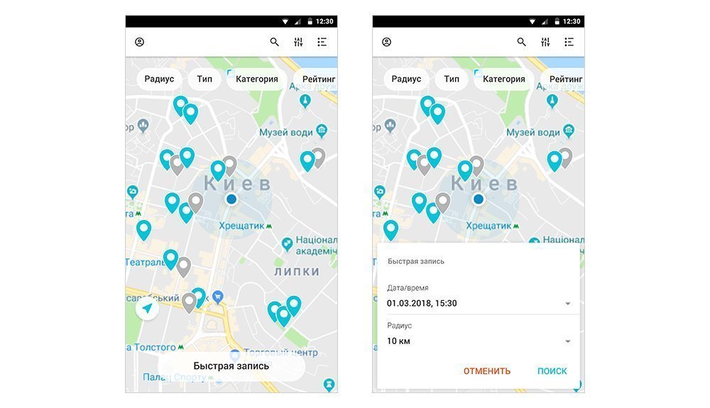 А также воспользоваться кнопкой быстрой записи: вбить дату и время, на которые хочет записаться, и радиус, в пределах которого искать. Приложение подберет подходящие варианты, останется лишь забронировать.