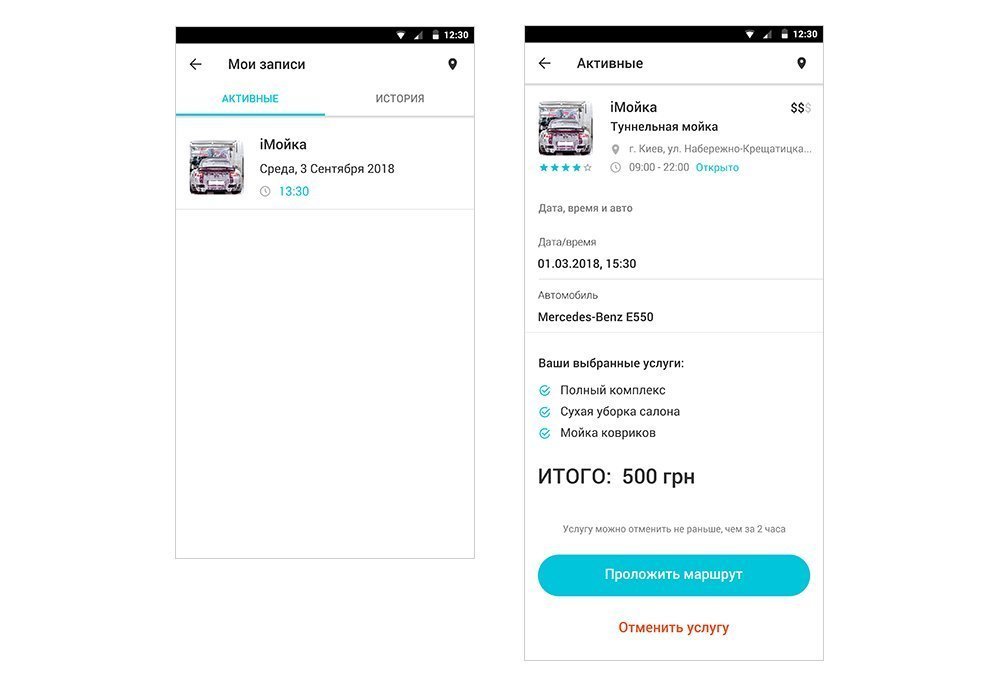 Клиент может отменить запись, если передумал. После подтверждения записи, доступна функция «Проложить маршрут»: открывается приложение «Google Maps» с построенным до мойки маршрутом.
