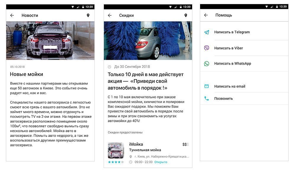 Приложение уведомляет пользователя о новостях сервиса и специальных предложениях и скидках автомоек.