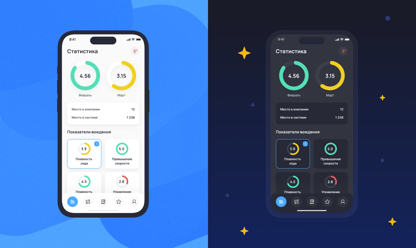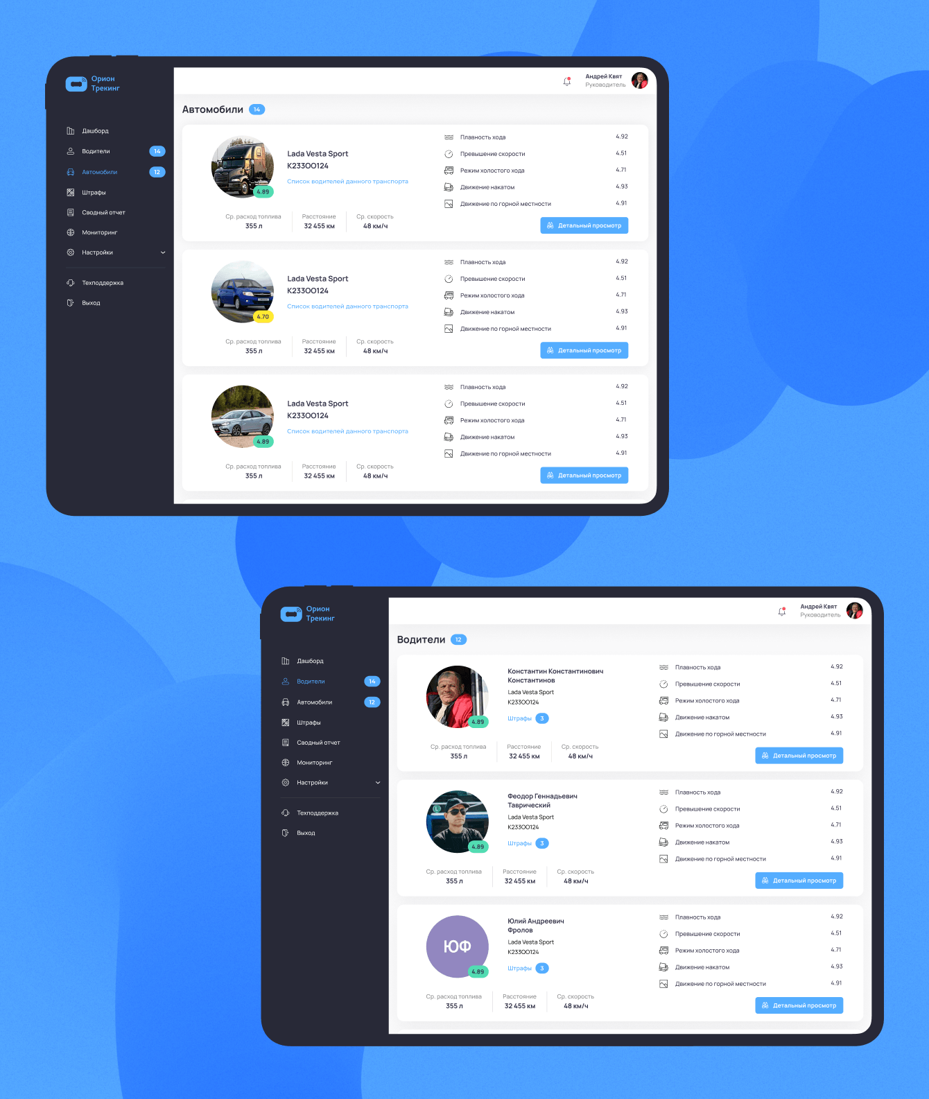 - дашборды водителей с подробной информацией и рейтингом, детализированные карточки транспортных средств.