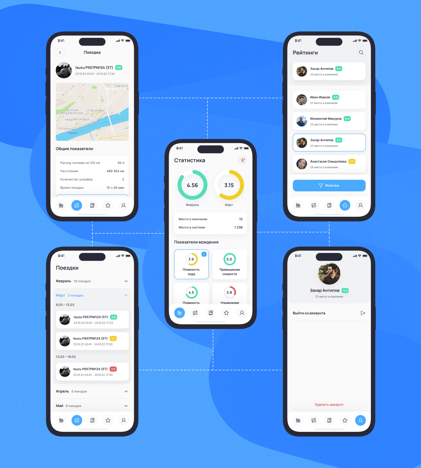 Водитель также может авторизоваться в сервисе, чтобы увидеть данные о своих поездках и рейтинге: открыть карту маршрута и посмотреть, какие ошибки он совершил, за что получил штрафы. С момента запуска сервиса это можно было сделать с помощью компьютера. Сейчас мы также запустили мобильное приложение, которое дает доступ ко всей необходимой водителю информации и позволяет авторизоваться на рейс без карты тахографа.