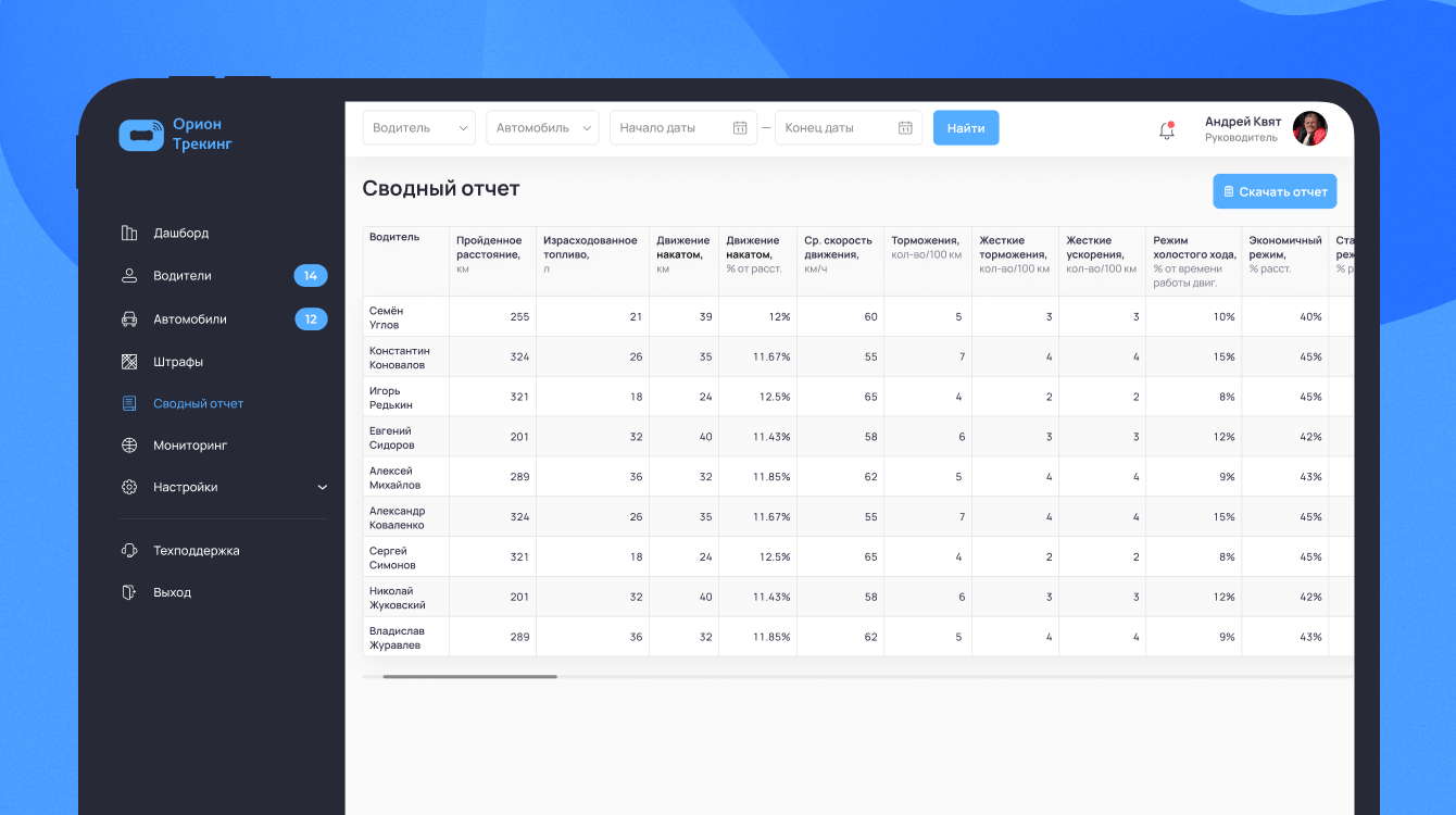 От нас требовалось разработать web-сервис, который сможет оперативно обрабатывать огромные массивы данных и предоставлять клиенту отчётность о состоянии автомобилей, качестве вождения водителей, маршрутах, расходе топлива и производить оценку по группам показателей. Также IT-решение должно было включать: