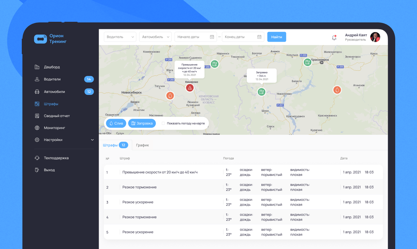 - интеграцию с ГЛОНАСС, интерактивную карту с возможностью отследить путь - машины, заправки и сливы топлива, места, где, водитель получил штрафы;