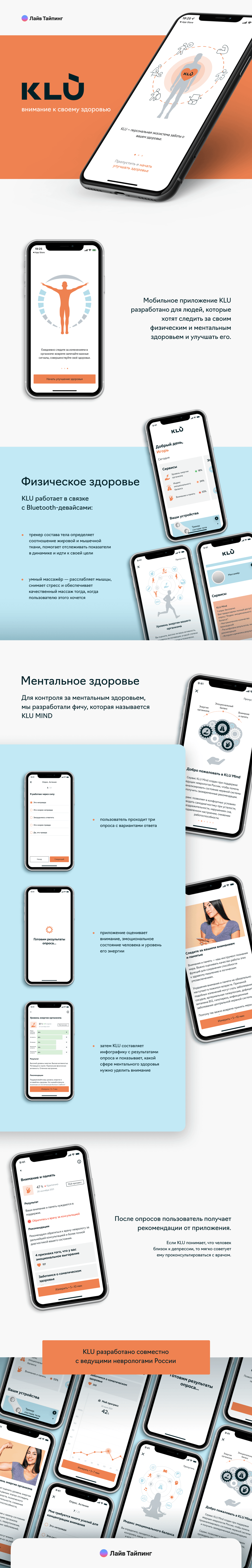 Клиент пришёл к нам с первой версией продукта. Приложение уже умело определять состав тела и делать массаж с помощью умных bluetooth-девайсов. Нашей задачей было создать сервис по контролю за ментальным здоровьем — KLU MIND.
