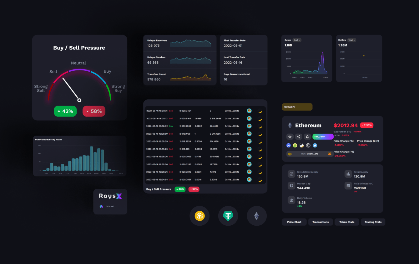 RaysX — это сервис по представлению аналитики криптовалют. По сути, это аналитический дашборд, с помощью которого пользователь может получить актуальную информацию о транзакциях, ликвидности, объеме торгов и других экономических показателях конкретной криптовалюты.
