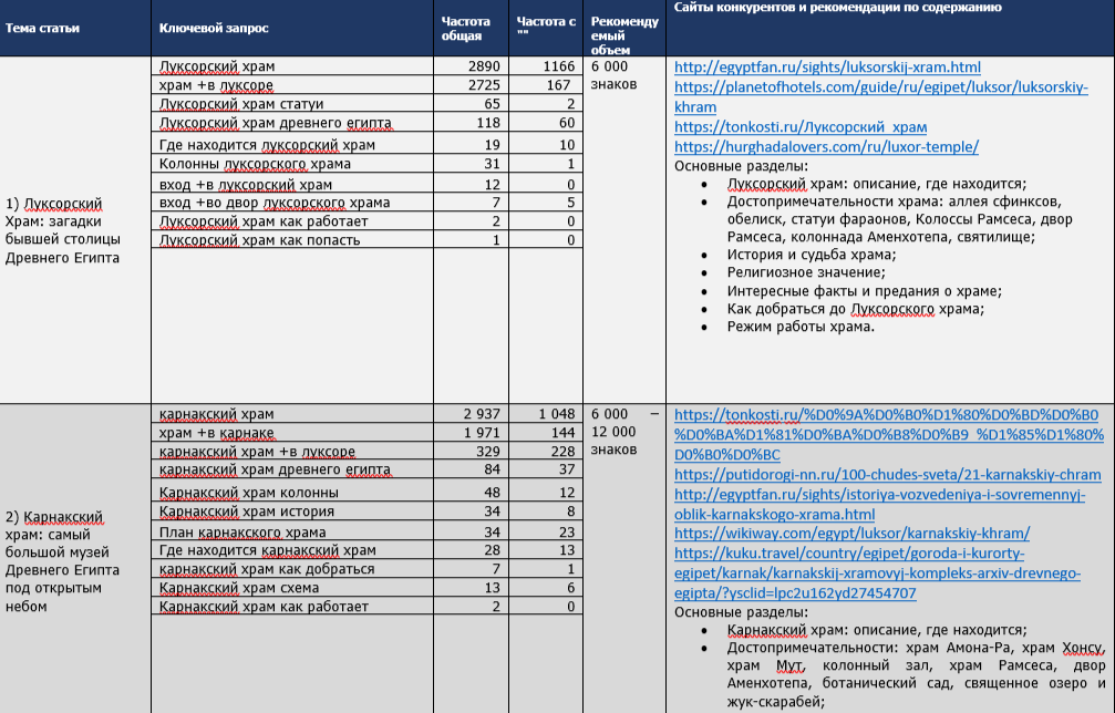 Был сформирован список из 10 тем, к каждой из которой мы подобрали необходимую для написания статьи информацию: ключевые слова для оптимизации текста и их показатели частотности; объем статьи, рассчитанный на основе анализа статей конкурентов; ссылки на материалы конкурентов; рекомендуемую структуру текста – основные разделы.