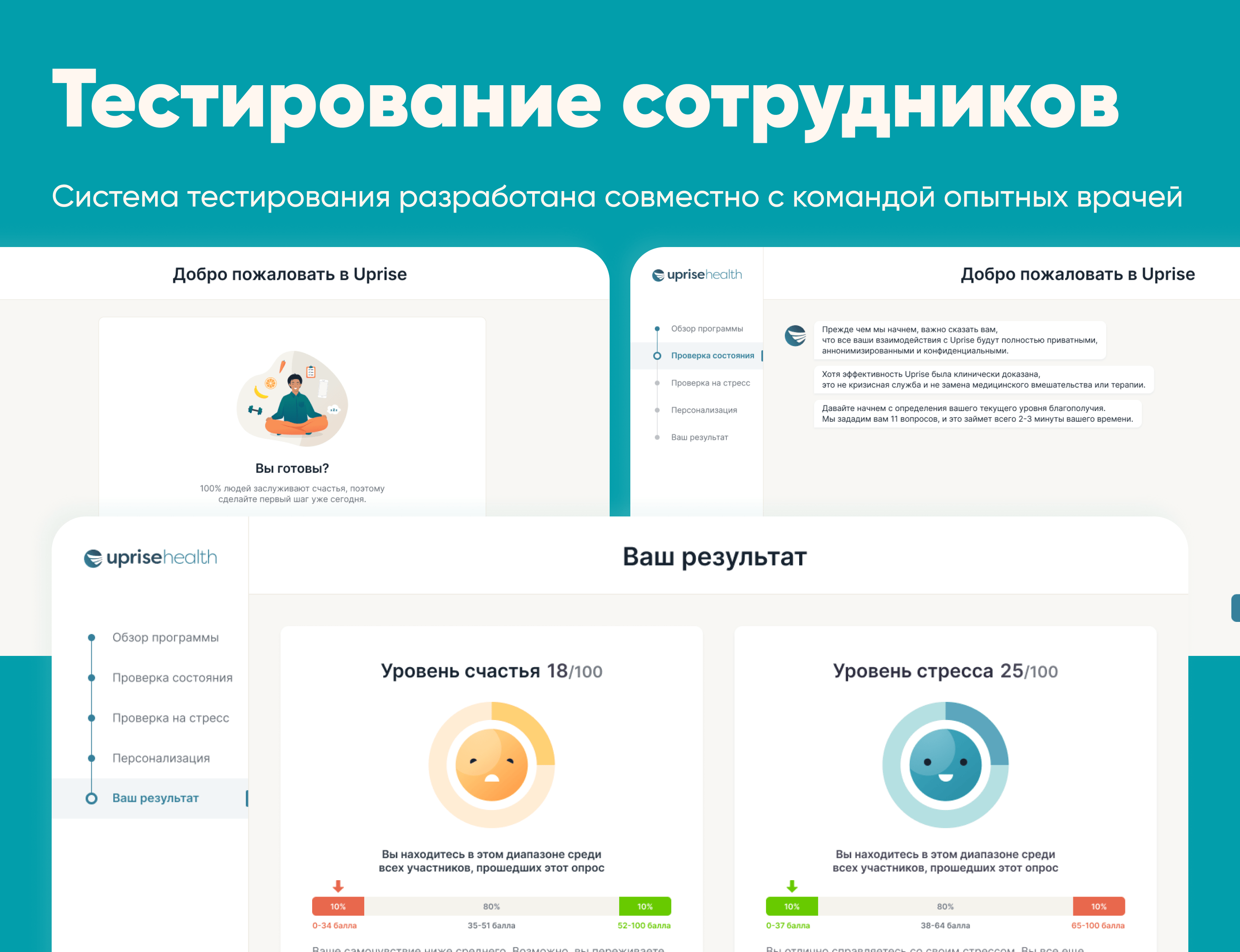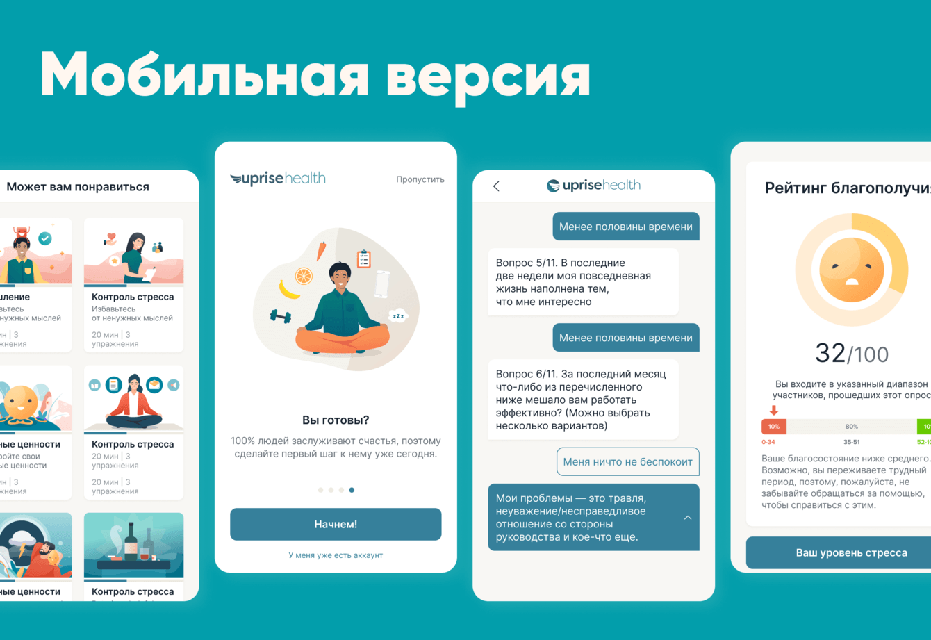 Мы внимательно изучили поступивший запрос и приняли решение с нуля разработать архитектуру приложения и оснастить его мощным движком, который мог бы проводить оценку результатов тестирования в режиме реального времени. После чего сотрудник мог бы получить индивидуальные рекомендации относительно своего психологического состояния и возможность работать над улучшением своего состояния.