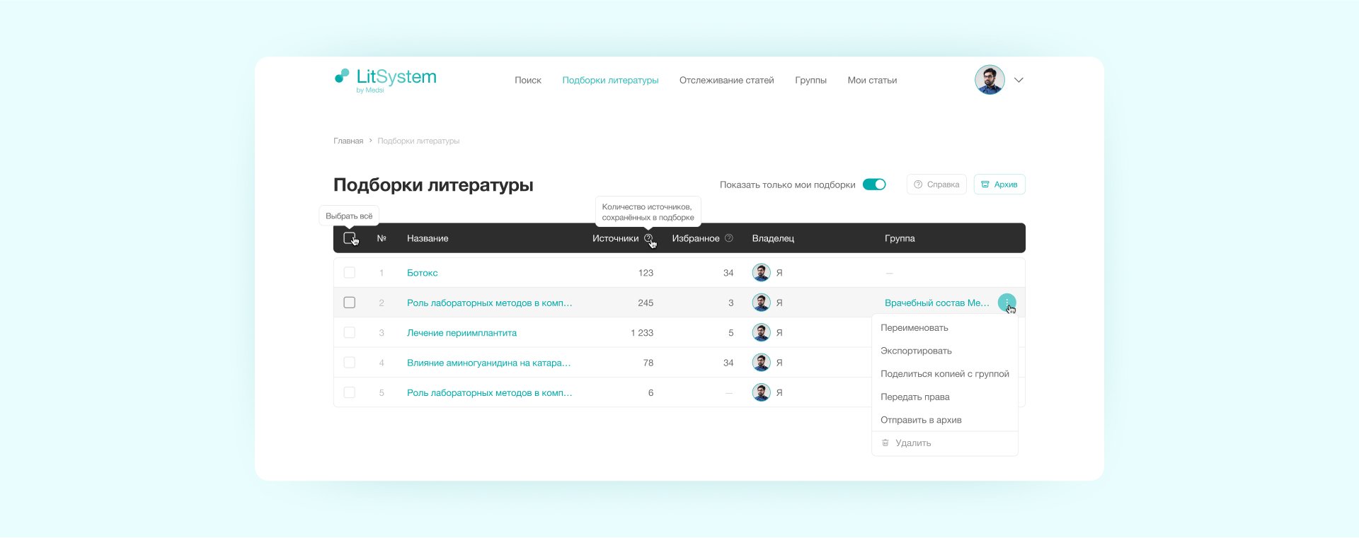 Функция создания подборок позволяет собрать актуальные статьи по теме и делиться ими с коллегами. В подборке можно делать заметки, добавлять статьи в избранное и экспортировать список литературы в нужном формате для научных работ.