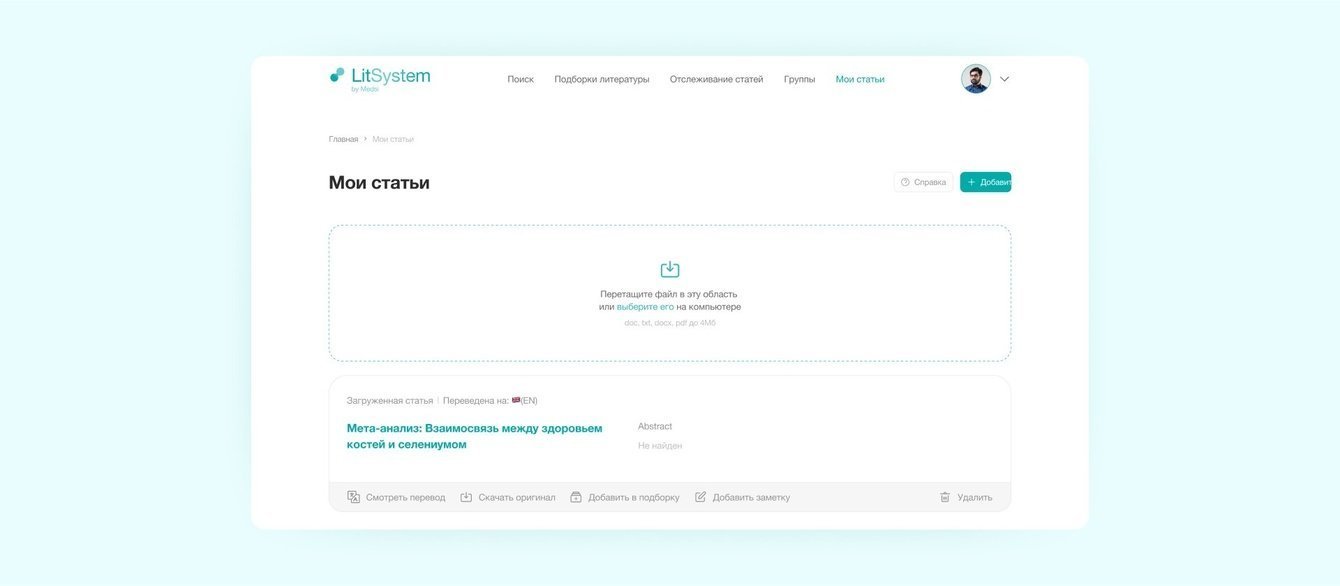 В разделе «Мои статьи» можно загрузить свои или найденные статьи, добавлять их в подборки, оставлять заметки и переводить на другие языки с помощью машинного перевода.
