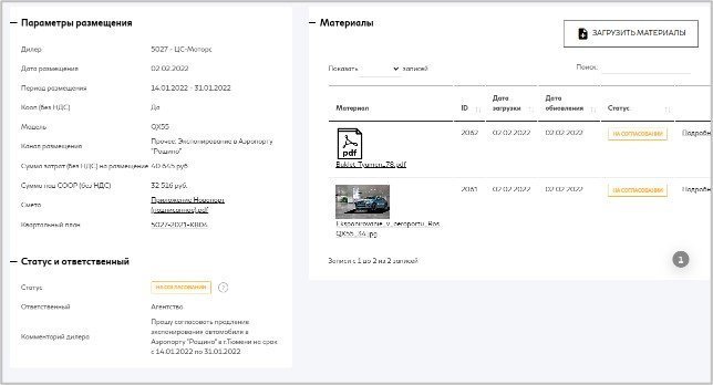 В рамках размещения необходимо добавить материалы, которые будут использоваться для Рекламной кампании. Дилер может дозагрузить материалы в любой момент.