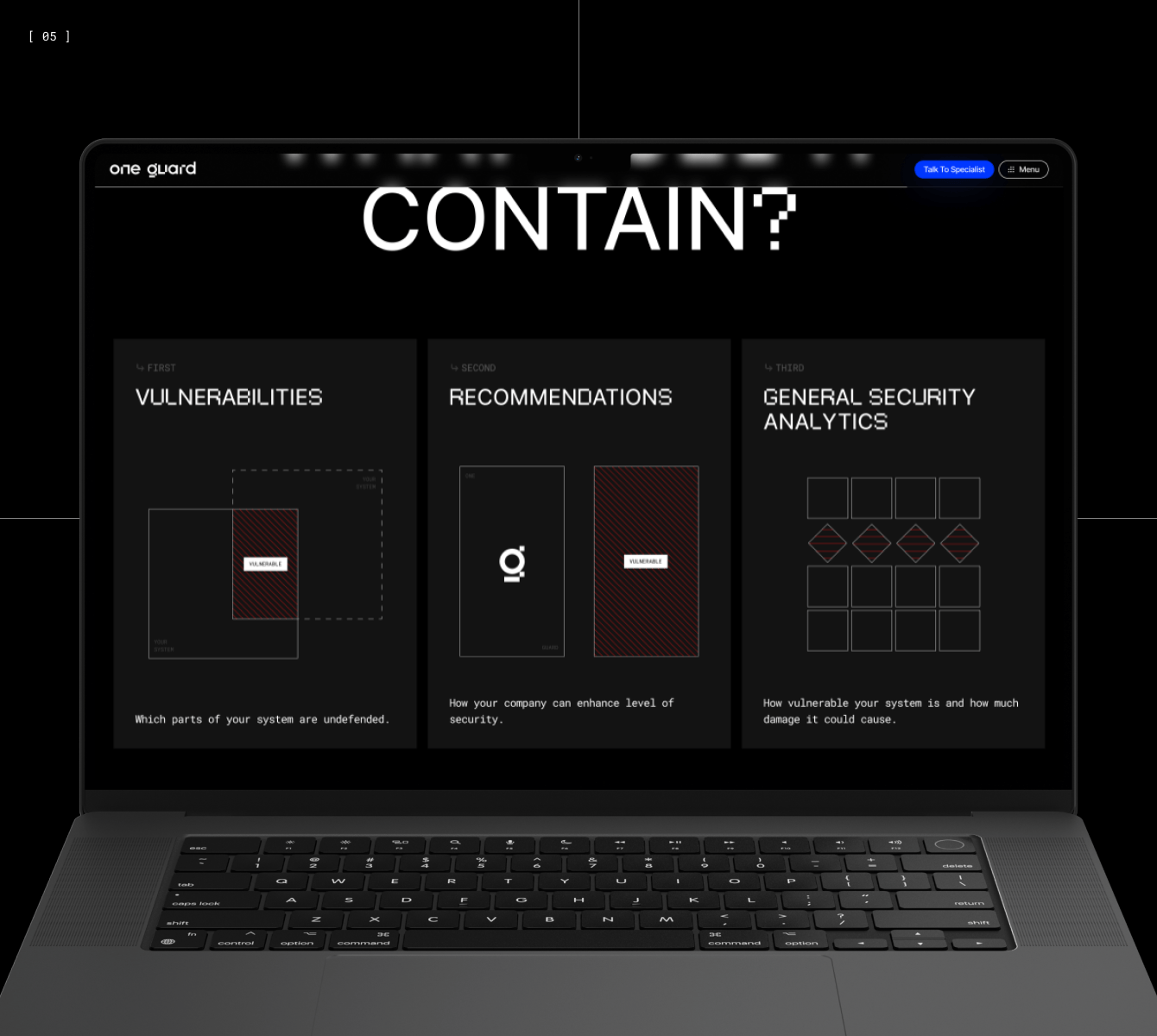 Чтобы разбавить текст на сайте, мы отрисовали абстрактные иллюстрации. Поинт про уязвимость отразили через два прямоугольника, на пересечении которых появляется красная область. Прокачку безопасности — через схематичный пластырь. А аналитику — через таблицу.