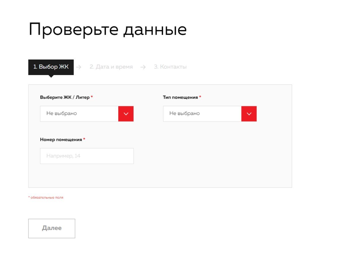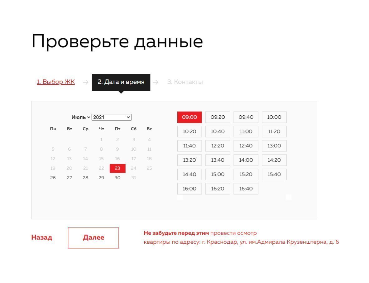 Нужно было упорядочить выдачу ключей и документов. Клиент дал задачу разработать сервис, в котором каждый дольщик сможет забронировать удобную дату и время приёма своей квартиры.