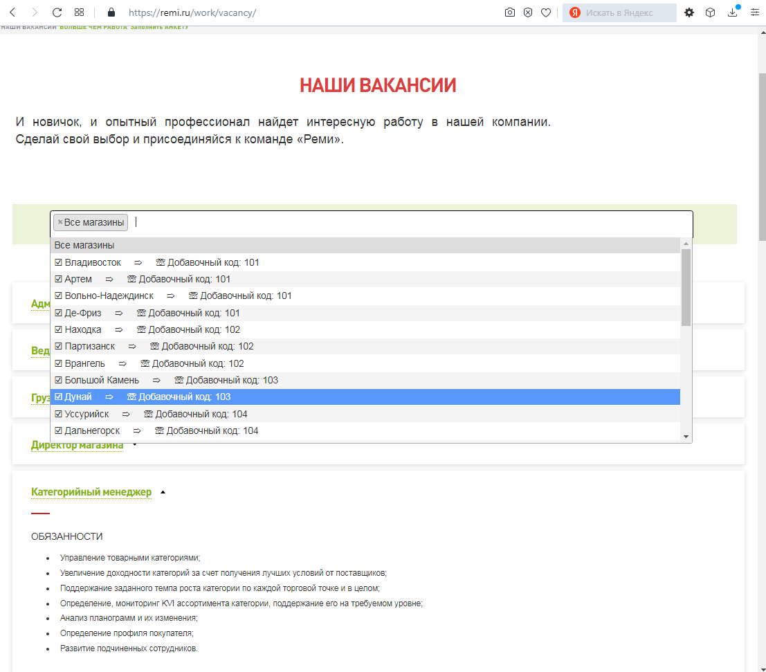 По каждой вакансии есть список требований. и Принадлежность к городу ( и / или магазину) где имеется эта вакансия.