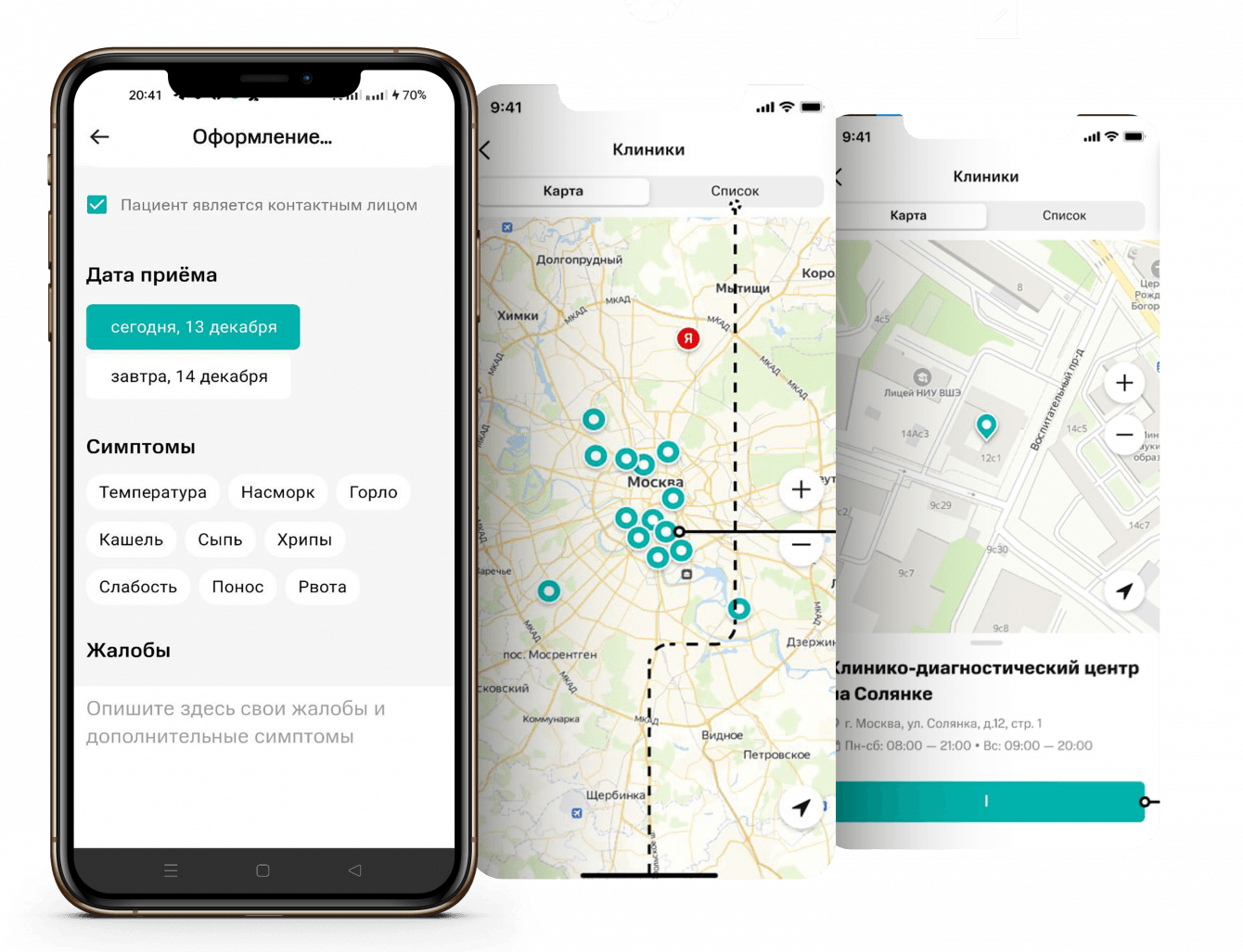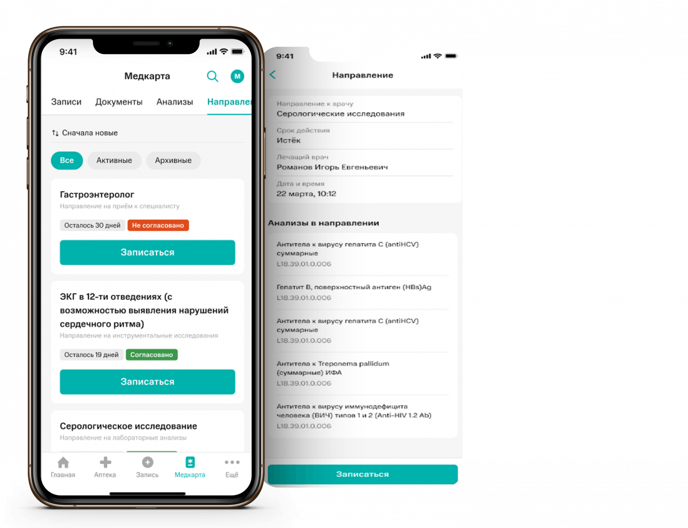 Один из основных модулей приложения для клиники, который позволяет записаться на online и очный прием к врачам различных специальностей.