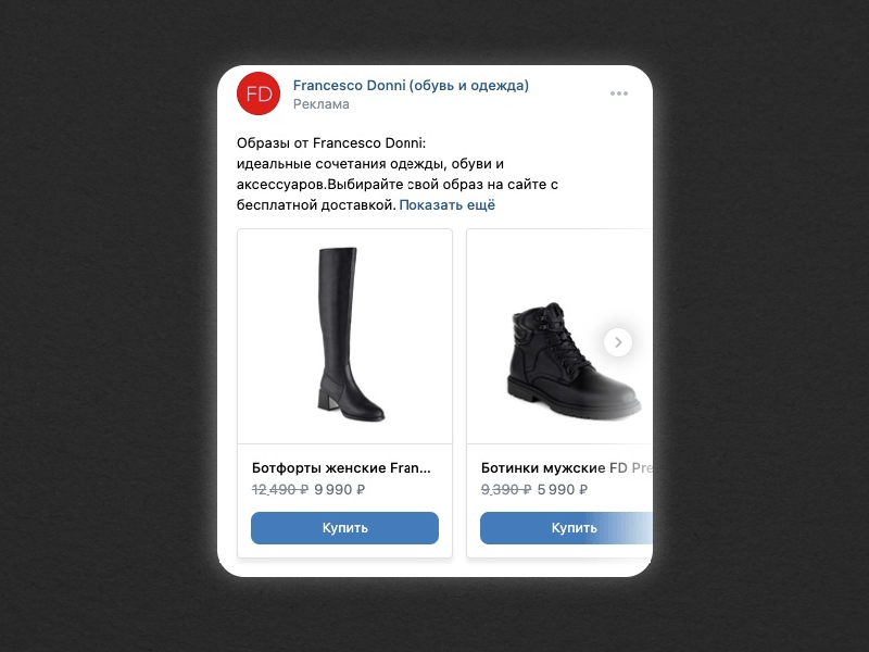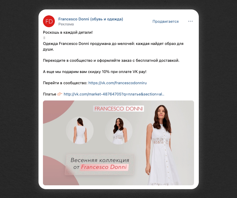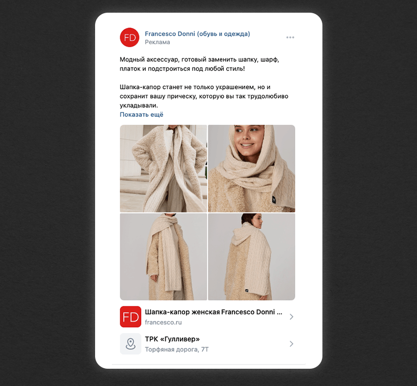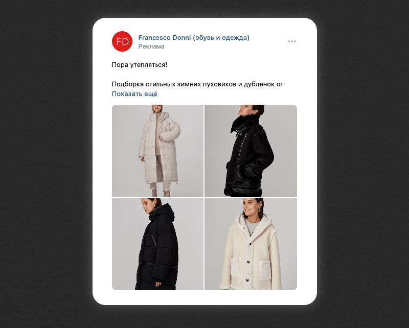 Первое касание. На первое касание мы выделили 40% бюджета на рекламу. Перед нами стояла задача перевести людей из холодной аудитории в теплую по минимальной цене. Поэтому решили делать не обычные посты, а создали рекламные объявления с сезонными подборками товаров.
