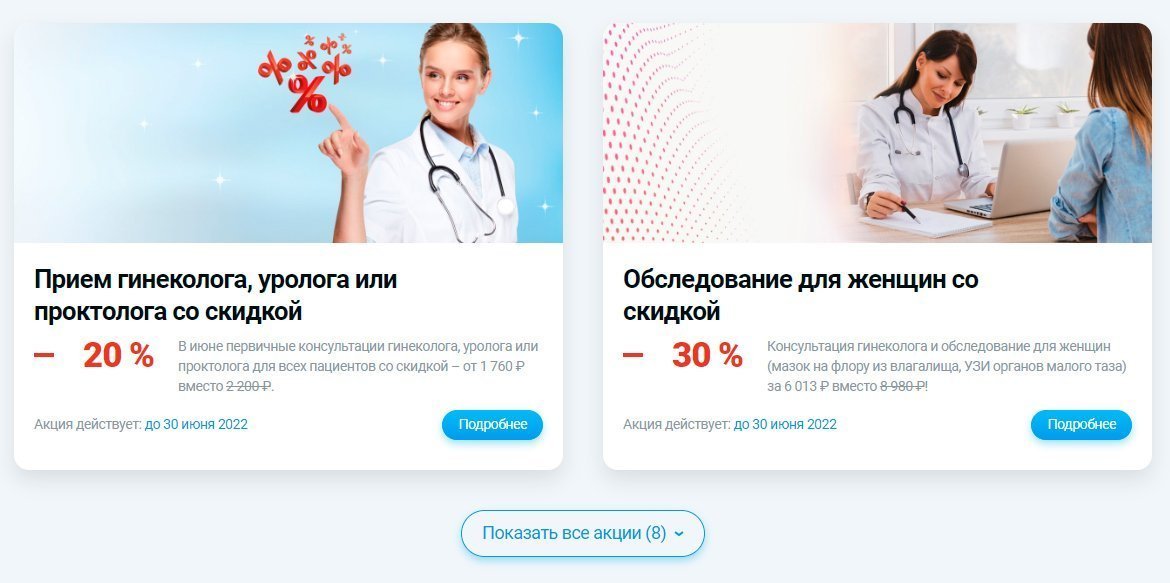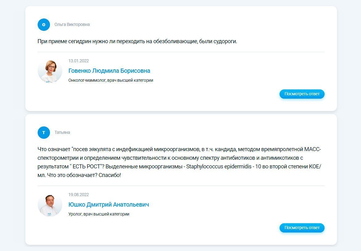 Для увеличения органического трафика был разработан раздел "Вопрос-ответ". Вопросы задают посетители сайта, отвечают на них доктора клиники. Чтобы посмотреть ответы, пользователю нужно увеличить глубину просмотра и перейти на внутреннюю страницу. Опубликовано более 1000 развернутых ответов.
