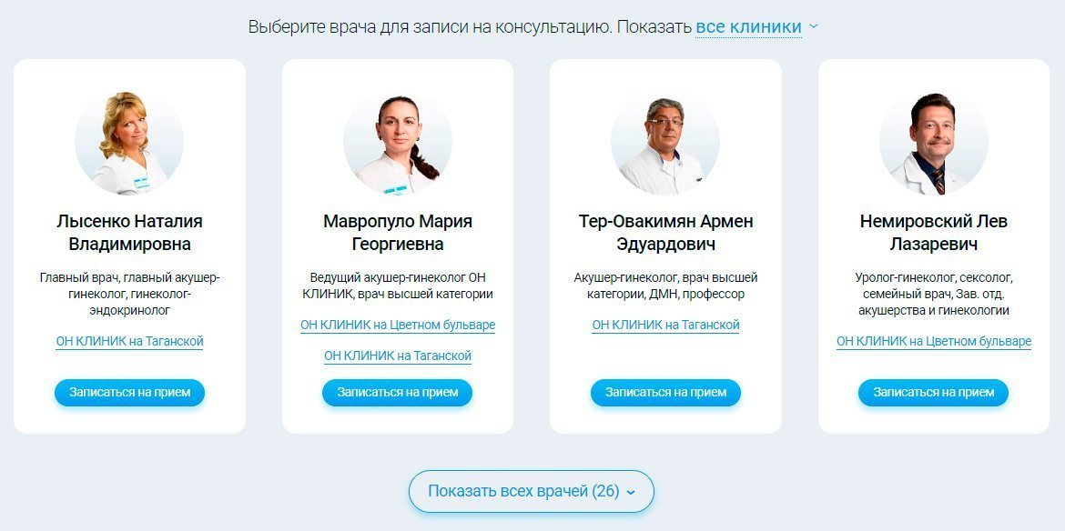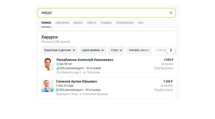 Врачи «ОН КЛИНИК» отображаются в специальном блоке Яндекса при вводе таких запросов, как "ЛОР", "Хирург". Для реализации задачи использовалась выгрузка в формате YML, также врачам были присвоены специализации, специально подобранные под семантическое ядро для улучшения в выдаче данного сниппета.