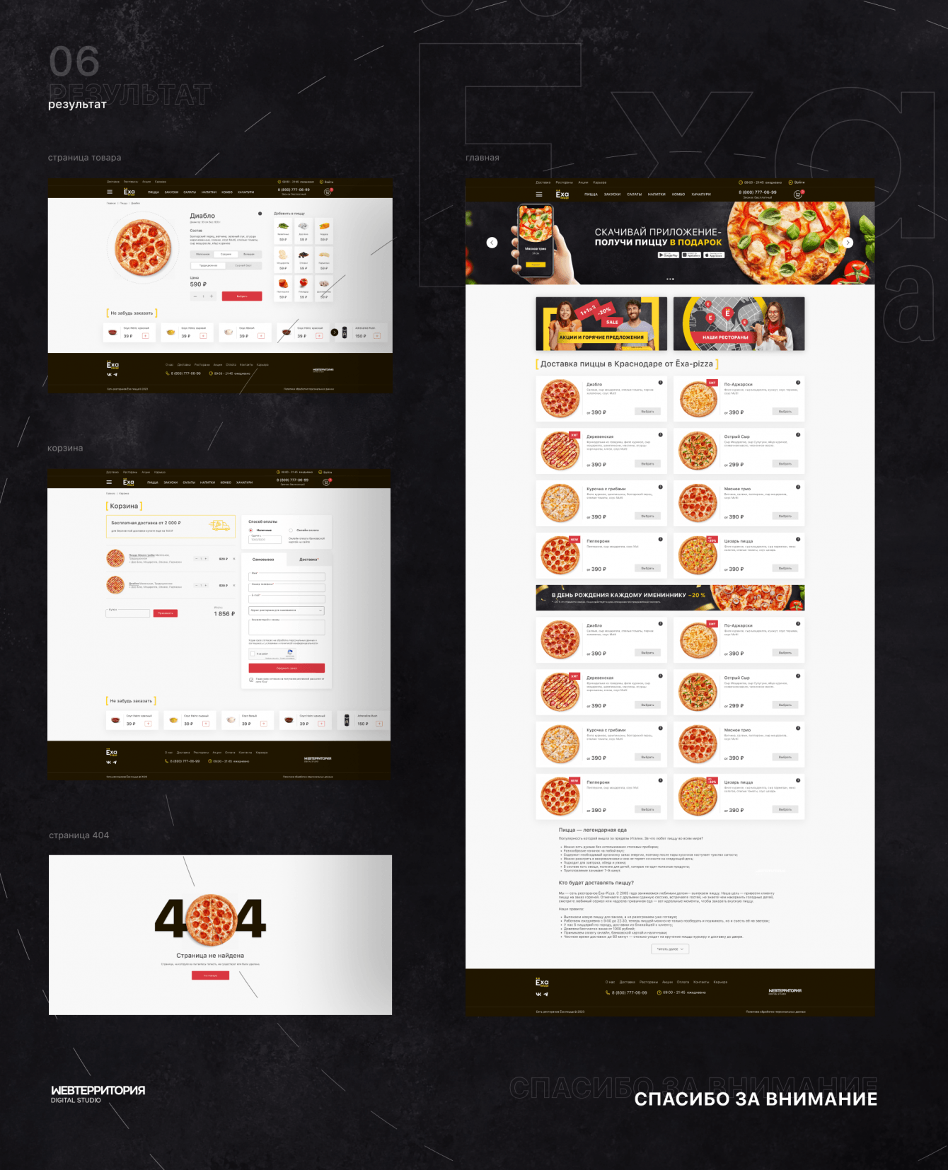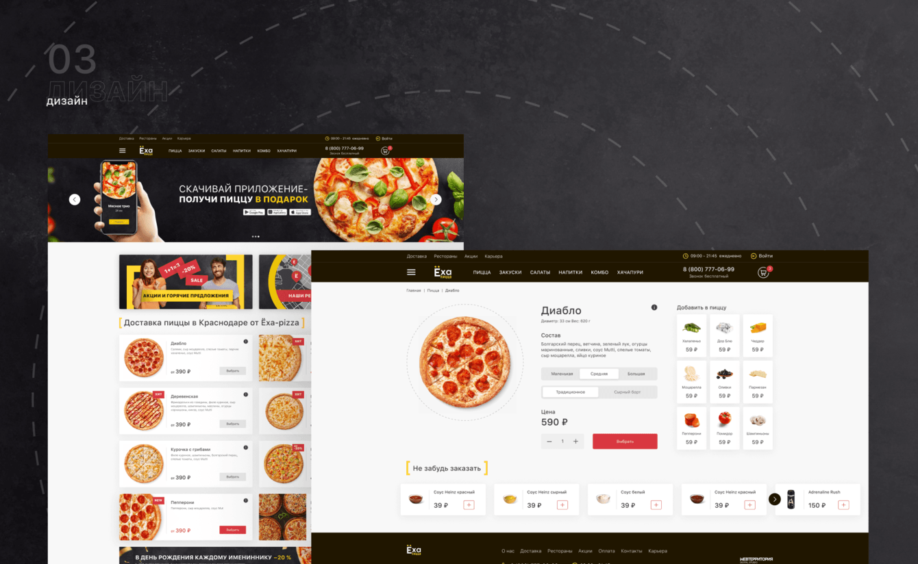 Дизайн сайта Ёха-пицца выполнен в современном минималистичном стиле, что делает его удобным и привлекательным для пользователей всех возрастов. Основной акцент сделан на простоте восприятия информации и удобстве заказа.