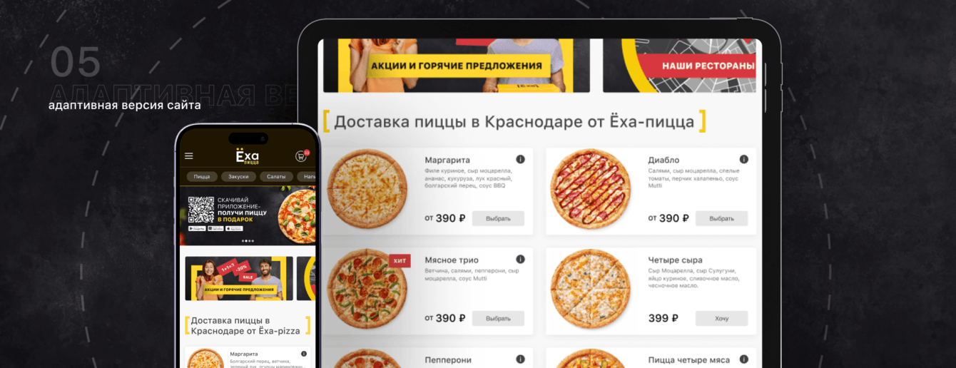 Адаптивная версия сайта Ёха-пицца сохраняет свою функциональность и удобство, оптимизируя элементы под меньшие экраны. Меню компактно складывается в иконку "гамбургер", что упрощает навигацию. Упрощается доступ к основным функциям — выбору пиццы, оформлению заказа и просмотру корзины, при этом не теряются визуальные акценты и качество изображений.