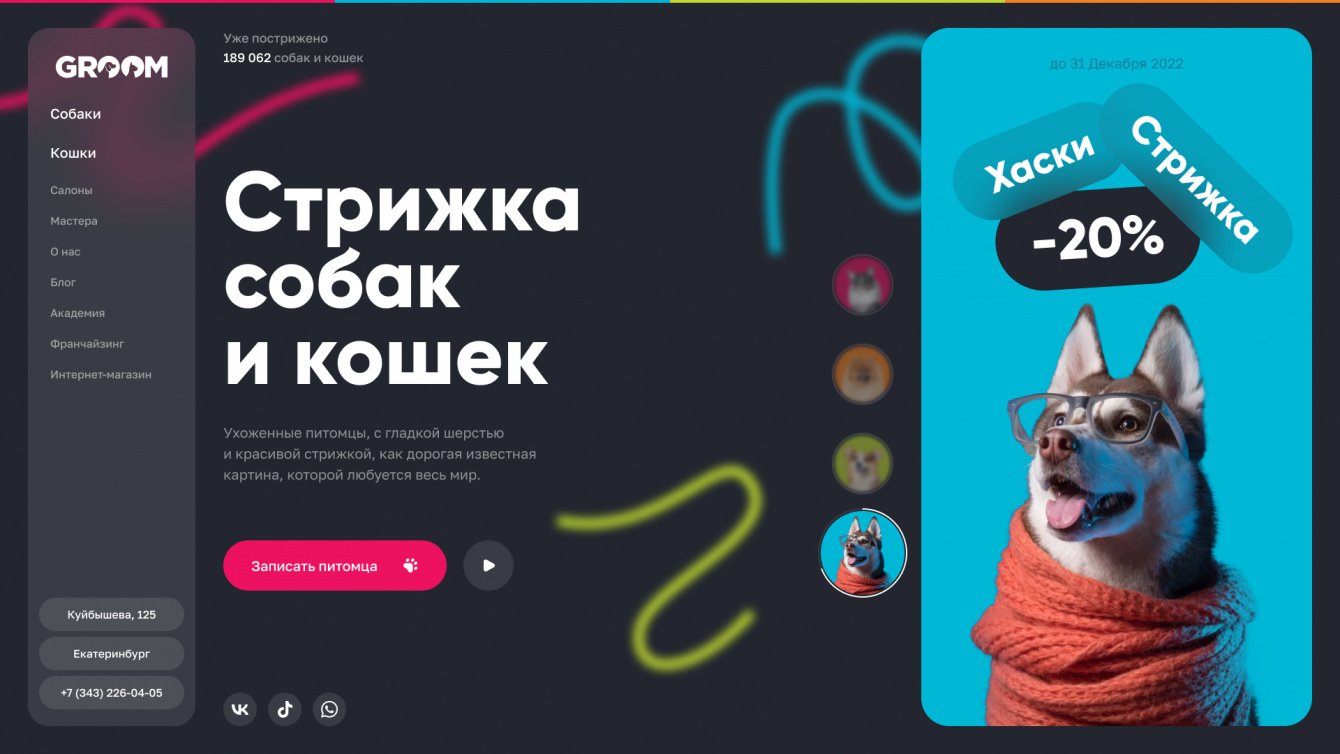 Изначально сайт компании Groom не был некрасивым или каким-то неправильным. Он был до безобразия скучным. Скука - это не то ощущение, которое должен вызывать такой сложный, но милый бизнес, как груминг собак и кошек. Компания Groom - это гуманность, развитие, качество и просвещение. И ценности компании запечатлены в цветах фирменного стиля, сохранить который мы клятвенно обещали.