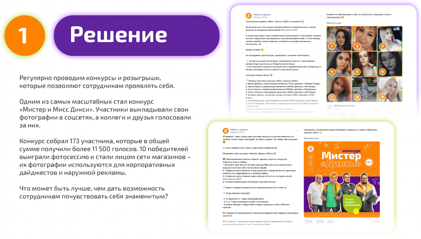 1. Регулярно проводим конкурсы и розыгрыши, которые позволяют сотрудникам проявлять себя. Одним из самых масштабных стал конкурс «Мистер и Мисс Дикси». Участники выкладывали свои фотографии в соцсетях, а коллеги и друзья голосовали за них. Конкурс собрал 173 участника, которые в общей сумме получили более 11 500 голосов. 10 победителей выиграли фотосессию и стали лицом сети магазинов – их фотографии используются для корпоративных дайджестов и наружной рекламы. Что может быть лучше, чем дать возможность сотрудникам почувствовать себя знаменитым?
