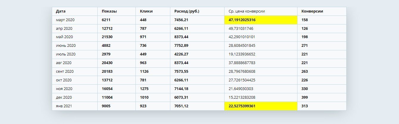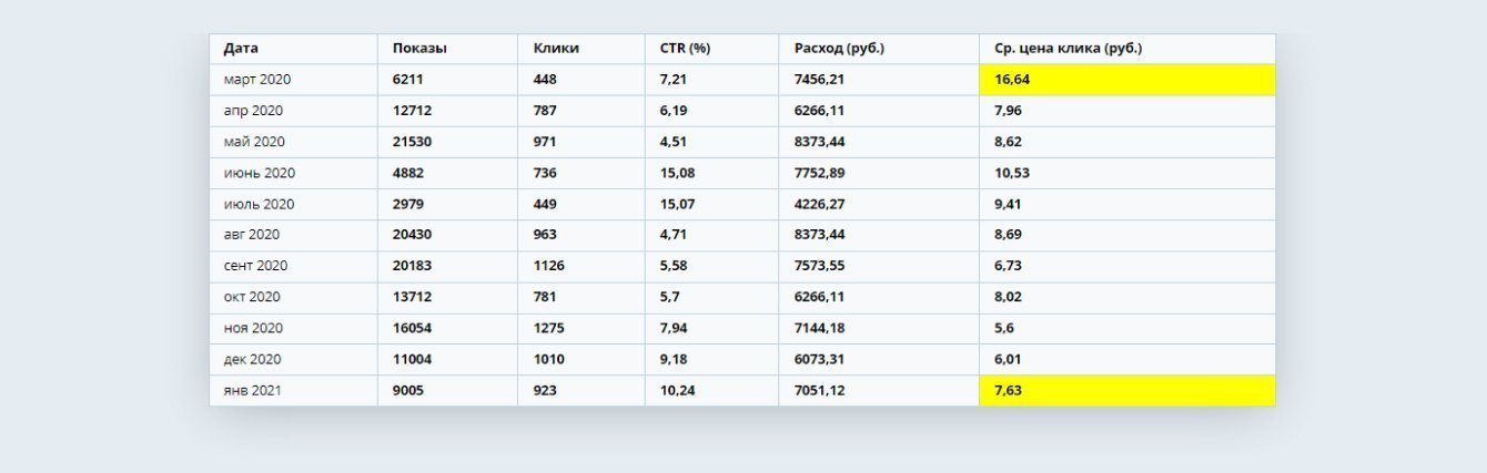 По итогам работы многократно меняли стратегию назначения ставок, экспериментировали с максимальной стоимостью клика, недельным бюджетом и типом рекламной кампании (динамическая, текстово-графическая, смарт-баннерная).