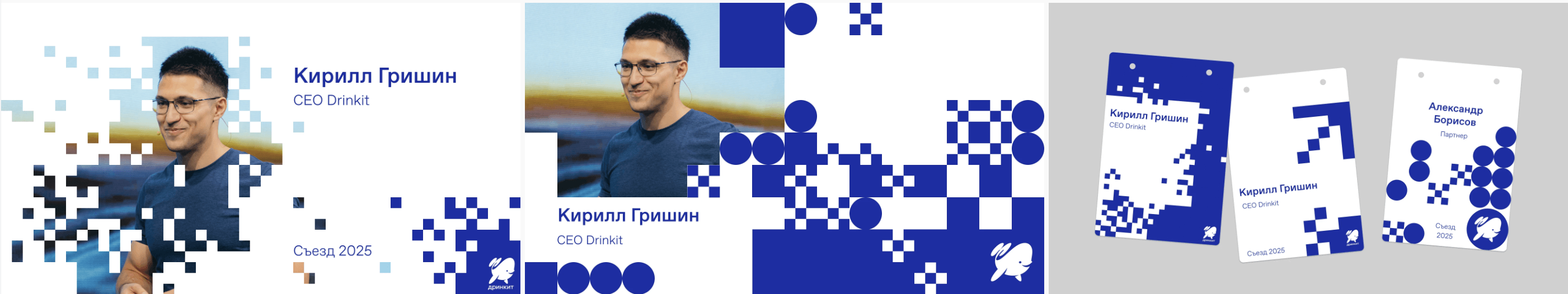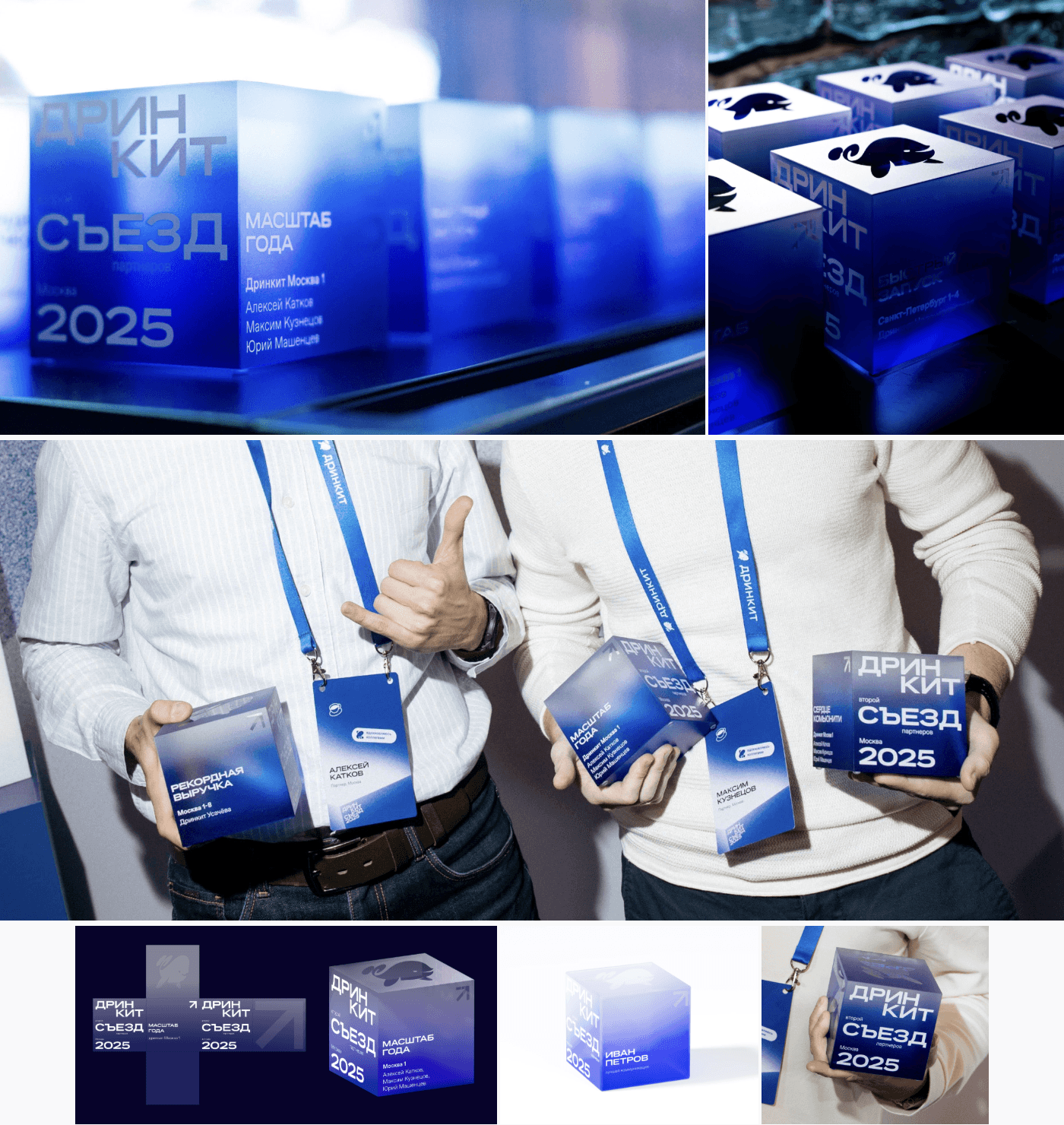 Идея куба родилась из обсуждения наград, и именно они стали одной из ключевых точек воплощения концепции. Стеклянные кубы с гравировкой Дринкит буквально вытаскивали айдентику в физический объект. Для нас это отдельная гордость: получились не просто сувениры, а интересные дизайнерские штуки, которые хочется держать в руках, ставить на видное место и хвастаться.