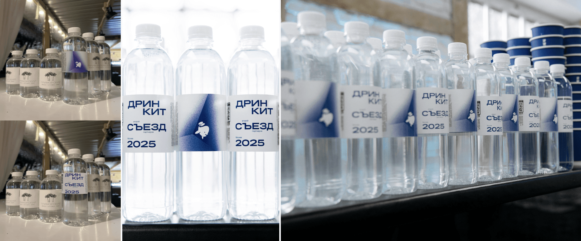 Даже бутылки воды стали элементом общей системы. На этикетке использовалась та же графика, что и в основной айдентике: белый фон, контрастный куб и логотип Дринкит в перспективе. Это решение помогло объединить все элементы событийного брендинга — от крупных баннеров до мелких деталей на столах.