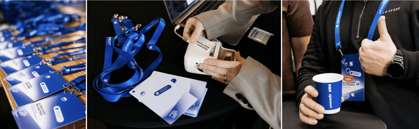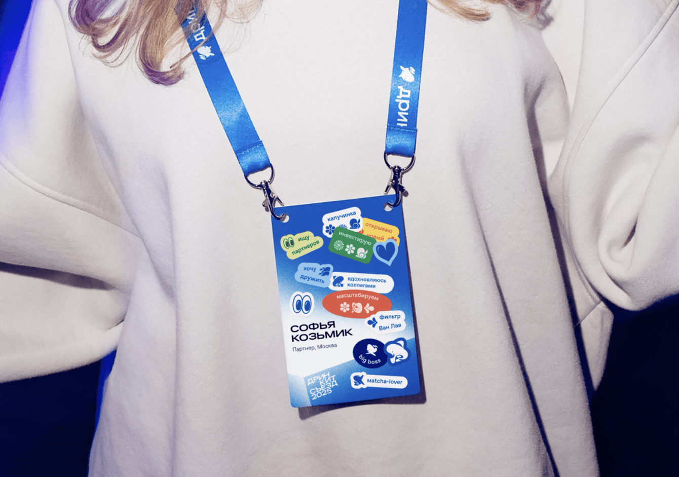 Задача бейджей — не просто идентификация, а возможность самовыражения участников. По просьбе клиента мы добавили свободное поле для тегов — участники могли выбрать стикеры вроде «поболтать», «найти партнёров» или «вдохновиться».