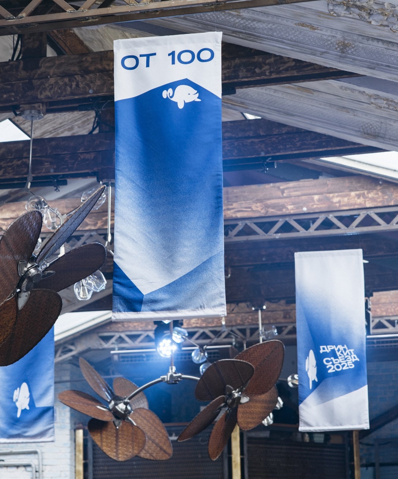 Работу над носителями мы начали с крупных элементов. Куб стал центральным акцентом: его использовали как основу композиции, а поверх выстраивали типографику. Мы пробовали триптихи, но в зале их было сложно разместить, поэтому остановились на парных флагах — каждый выглядел как самостоятельный плакат.