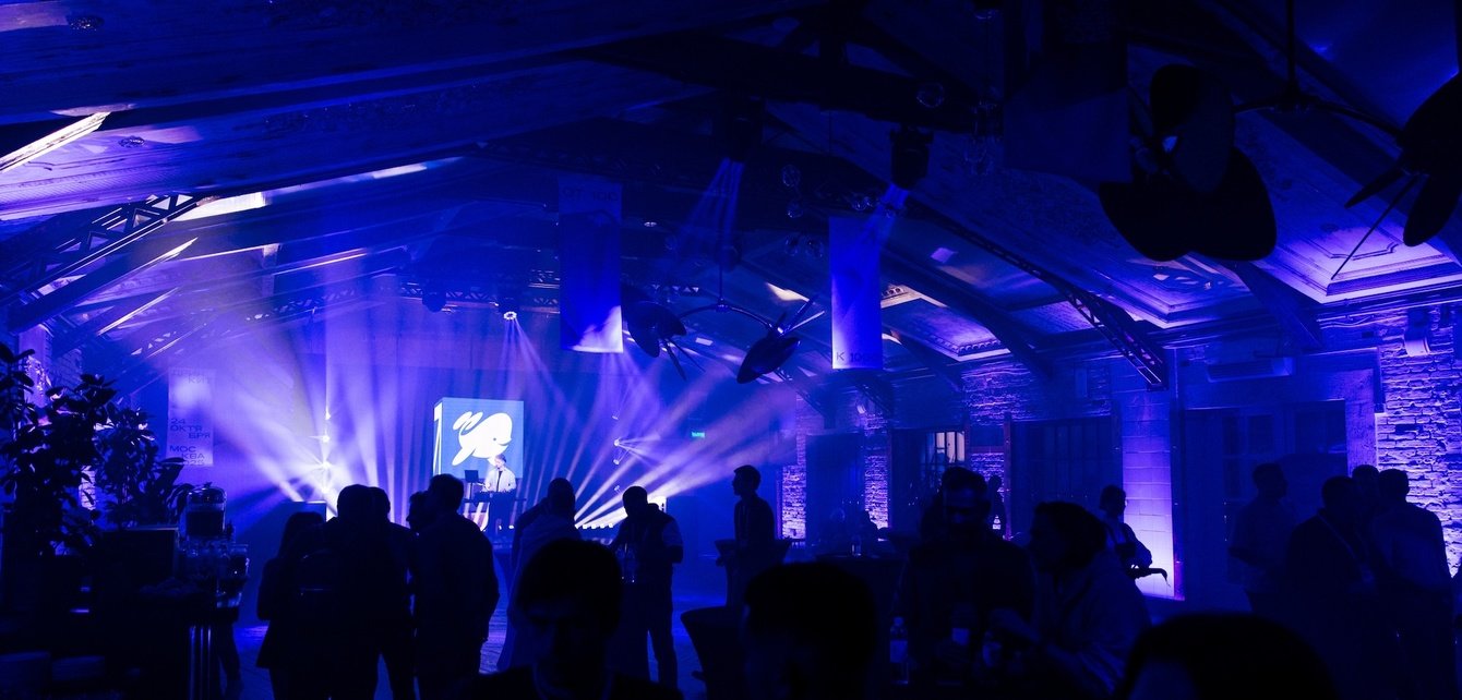 Офлайн-часть — про атмосферу и режиссуру. Мы сделали основную заставку открытия, фоновые лупы для перерывов и визитки для всех спикеров. Моушен помогал выстраивать ритм: мягко переходить между блоками и закрывать паузы. На неформальной части, когда на сцене был диджей, эти же видео создавали визуальный фон и настроение.