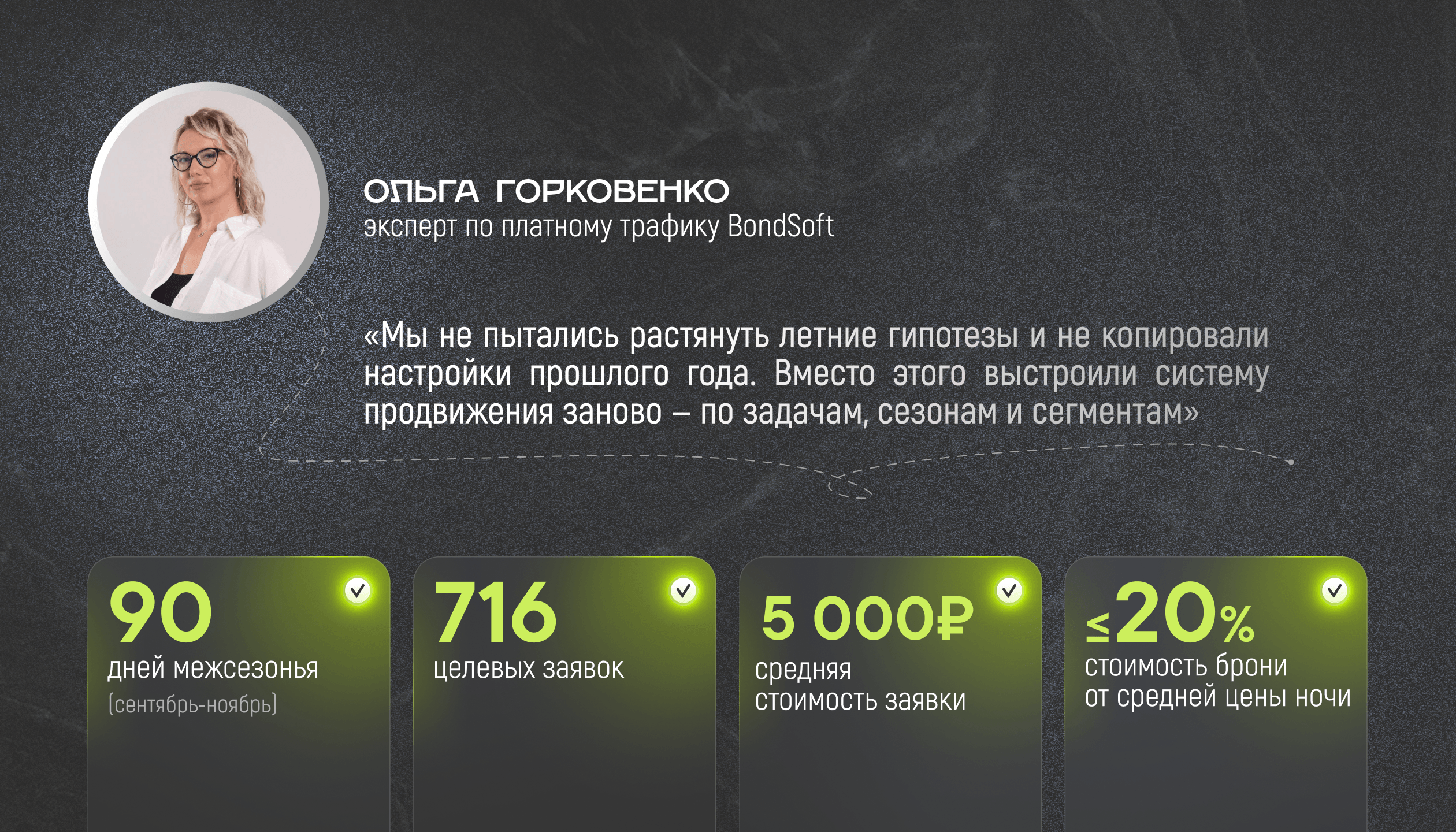 Убрали промежуточные показатели, которые только засоряли картину. Перфоманс-оптимизация — только на макроконверсиях. Реальные бронирования, реальное поведение гостей. Без лишнего снегопада в отчётах.
