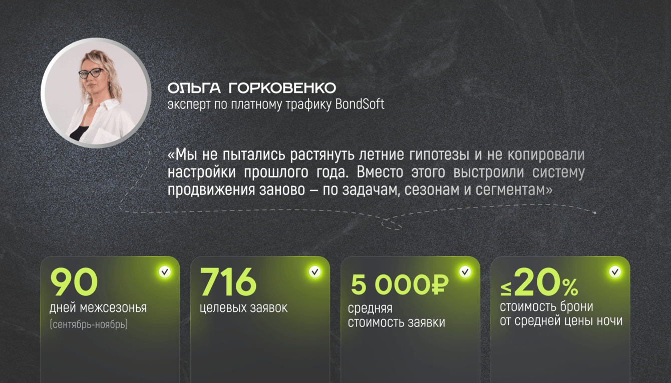 Сентябрь стал для нас точкой старта: мы приступили к трансформации рекламной системы — с учётом предстоящего зимнего сезона и меняющегося спроса. До этого кабинет работал преимущественно на бренд, wellness, бархатный сезон, осенние ретриты.