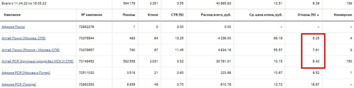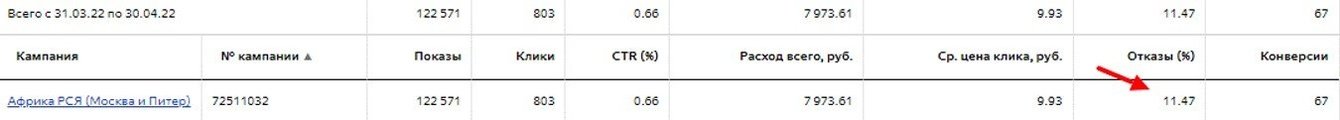 Как показала практика, на выходе с графической РСЯ мы получили лишь слив бюджета и отказы до 60%. Отключили эту кампанию через 2 дня.