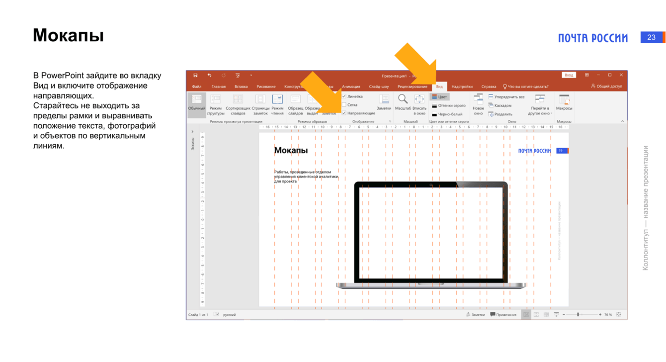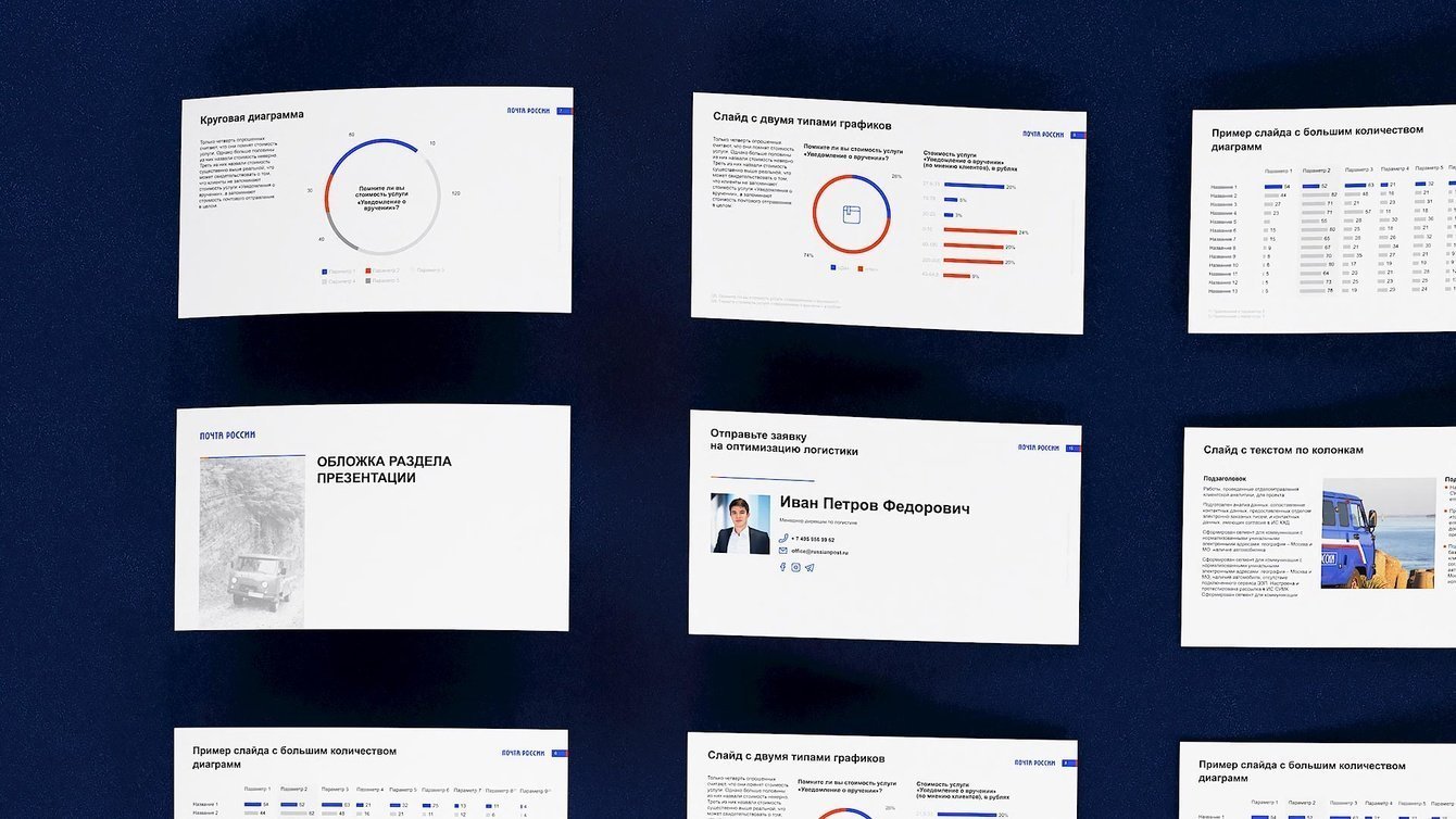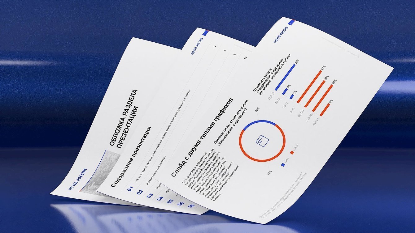 Студия B2B-коммуникаций VisualMethod разработала шаблон корпоративной презентации для Почты России и инструкции для работы со слайдами. После завершения основного проекта клиент заказал разработку шаблонов для узких задач согласования сделок, инвестпроектов, цифровых проектов и других направлений.