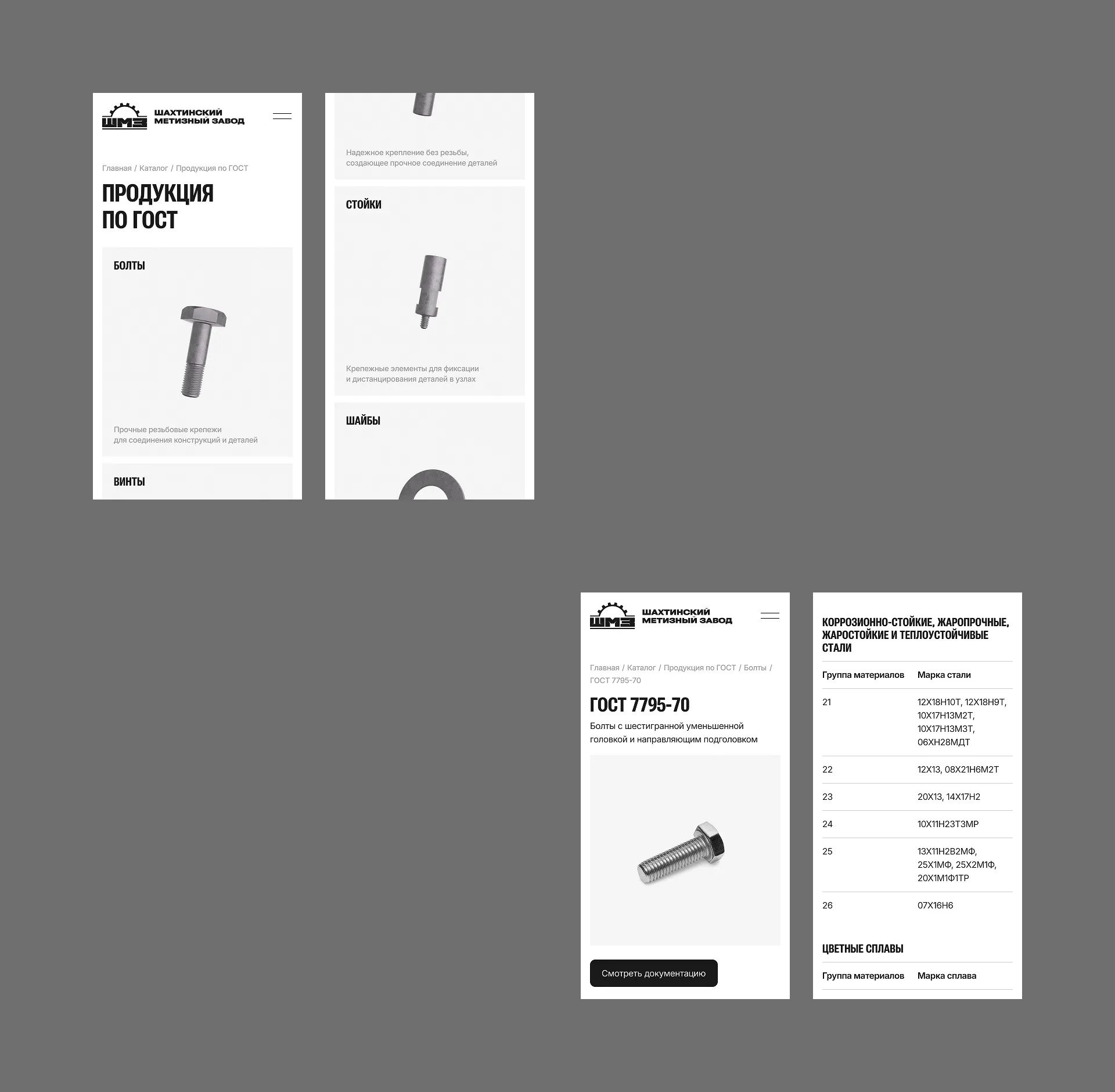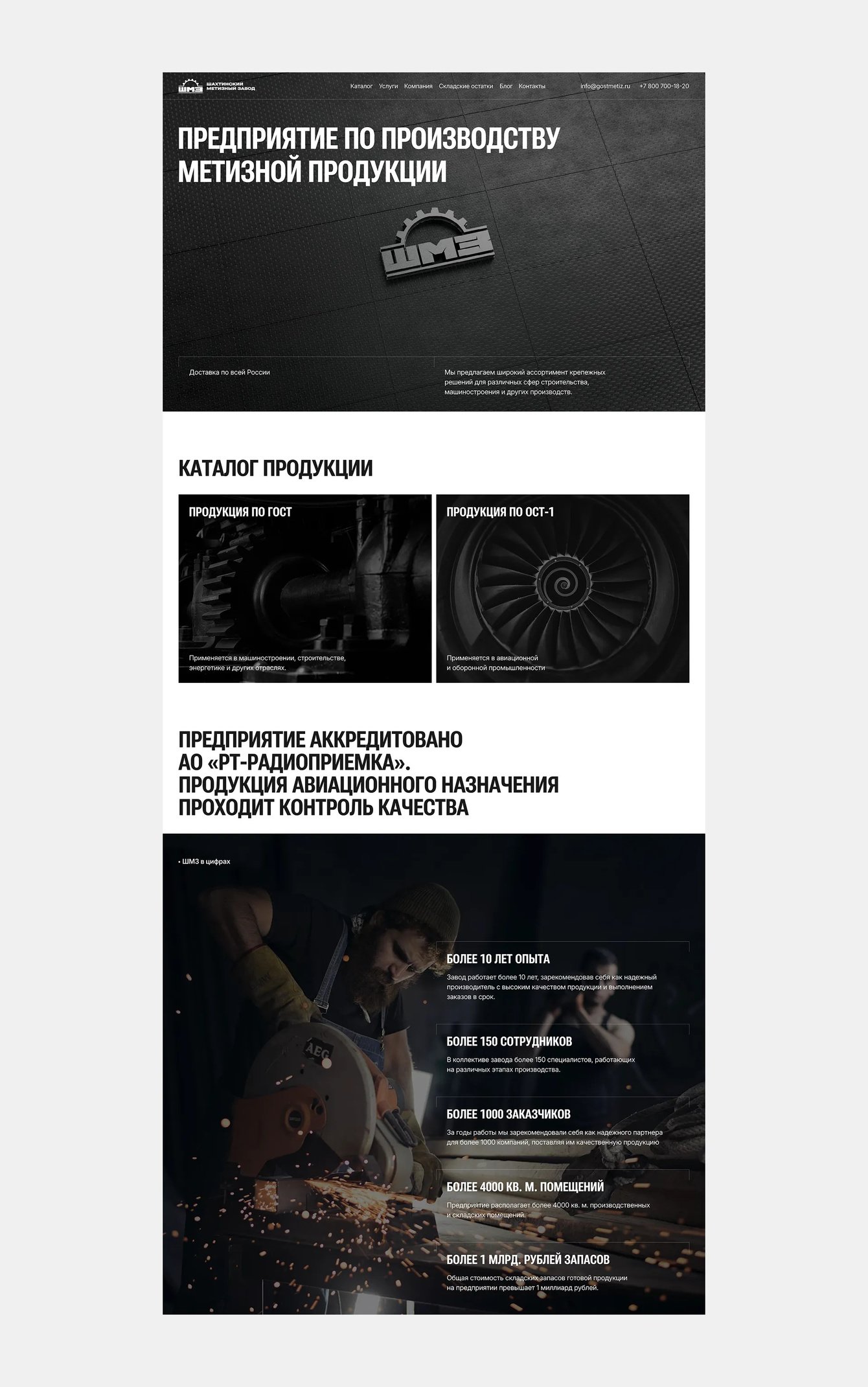 Основной упор был на разработку дизайна и 3D-элементов. Сделали адаптивную мобильную версию с сохранением всей логики и интерфейсных решений. Текстовые блоки — короткие, структура выстроена вокруг продукции и доказательств экспертности: ГОСТ, аккредитация, опыт, сотрудники, масштабы.