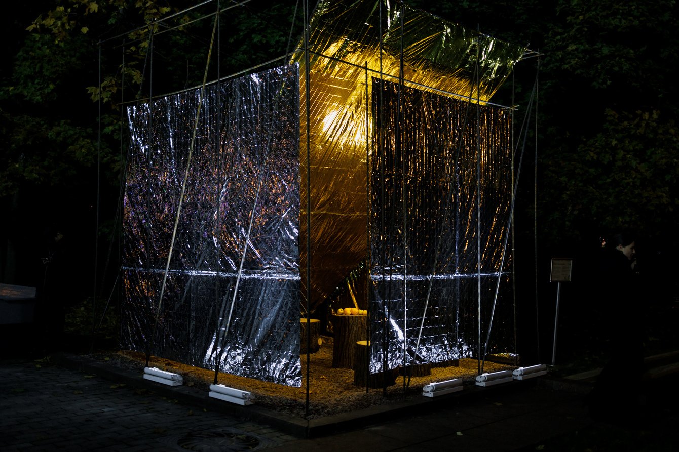 «Три с половиной» (Владимир Изаксон). Конструкция объекта (именно столько стен в авторском шалаше) была сделана из тончайшего листа золотистой пленки с внутренней стороны и серебристой — с внешней. Выбор такого ненадежного материала автор обусловил идеей полного доверия всевышнему.