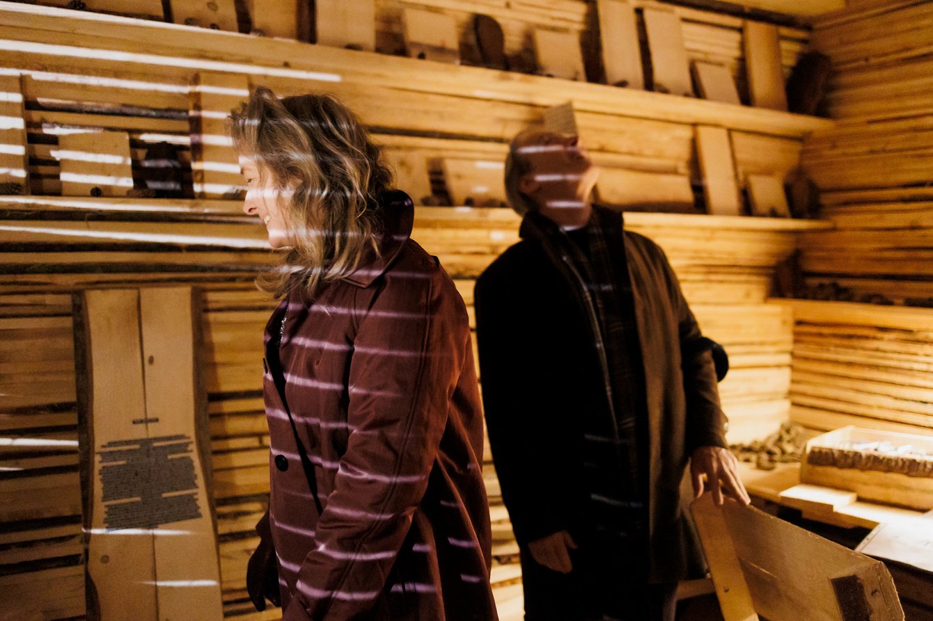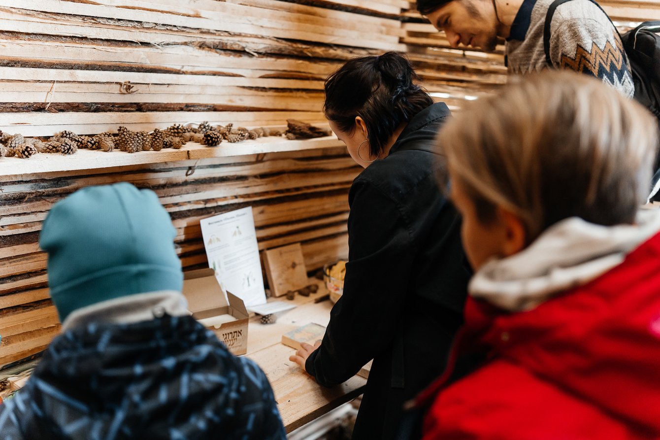 «600 досок» (Артем Стаборовский, Михаил Бейлин). Главным декором сукки выступила сосновая кора на торцах досок, а воздух внутри шалаша был наполнен ароматом осени. Здесь гости поучаствовали в благоустройстве дома: каждый нанес цветными карандашами, черной и алой тушью изображение на еловую дощечку и, найдя ей место на полке, украсил аскетичный интерьер.
