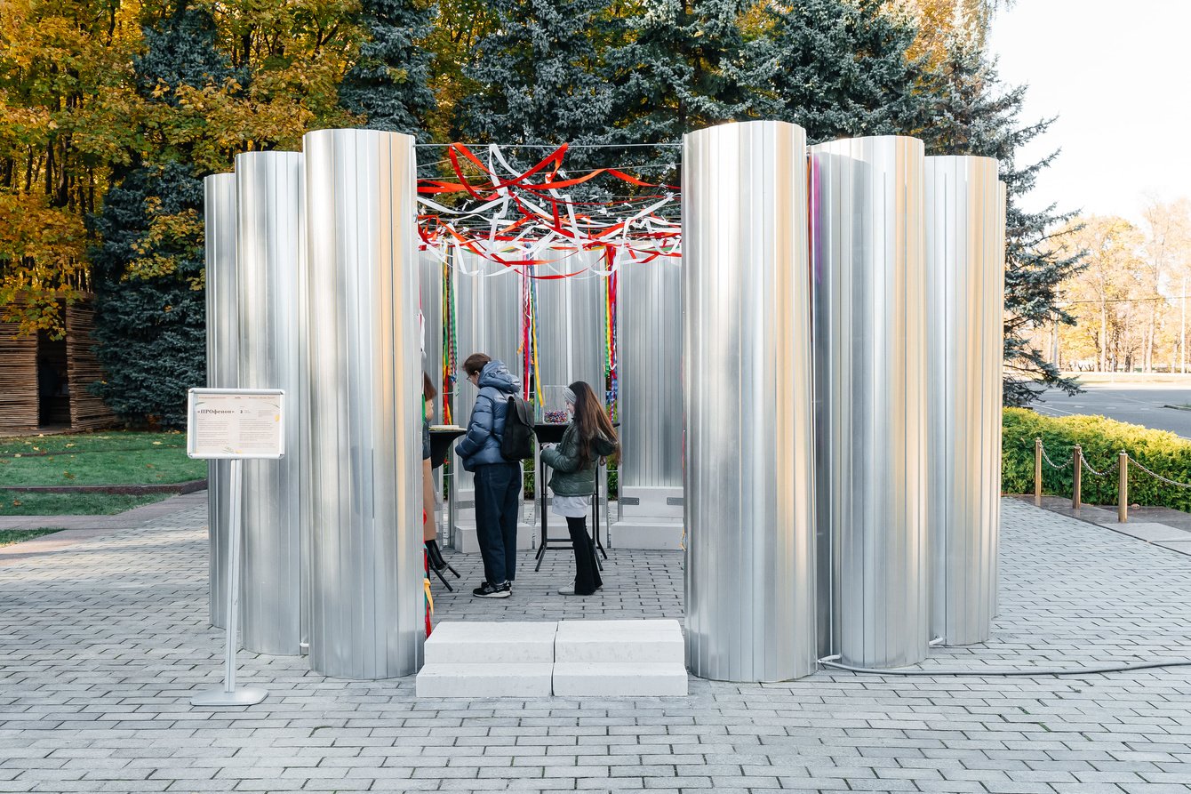 «ПРОфенон» (Дарья Зайцева) — история про замыкание цикла и объединяющую центростремительную силу: полые полукруглые металлические колонны, перетянутые праздничными лентами, стремились к невидимому центру сукки — внутреннему пространству, в котором собираются люди на Суккот.