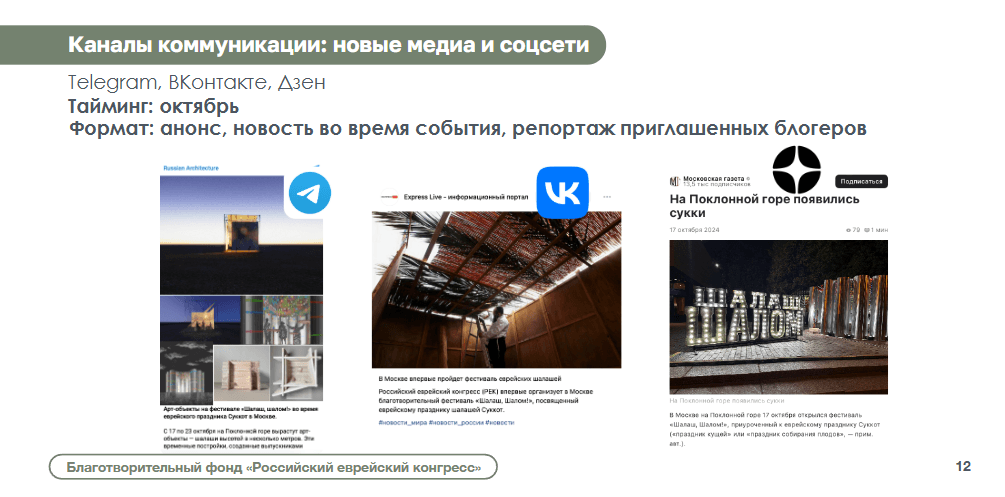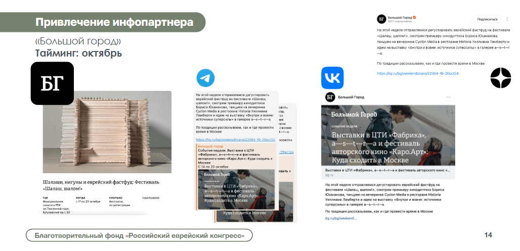 Были четко сформулированы коммуникационные задачи: популяризировать еврейскую культуру среди жителей Москвы и туристов, создать площадку для межкультурного диалога. Еще одной важной задачей стало привлечение средств на обучение детей из малообеспеченных семей в школе «Маалит».