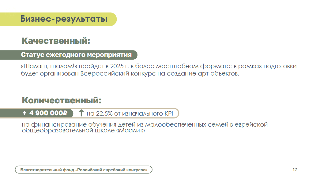 - Организовать сбор средств на обучение детей из малообеспеченных семей в школе «Маалит». KPI: не менее 4 млн руб.