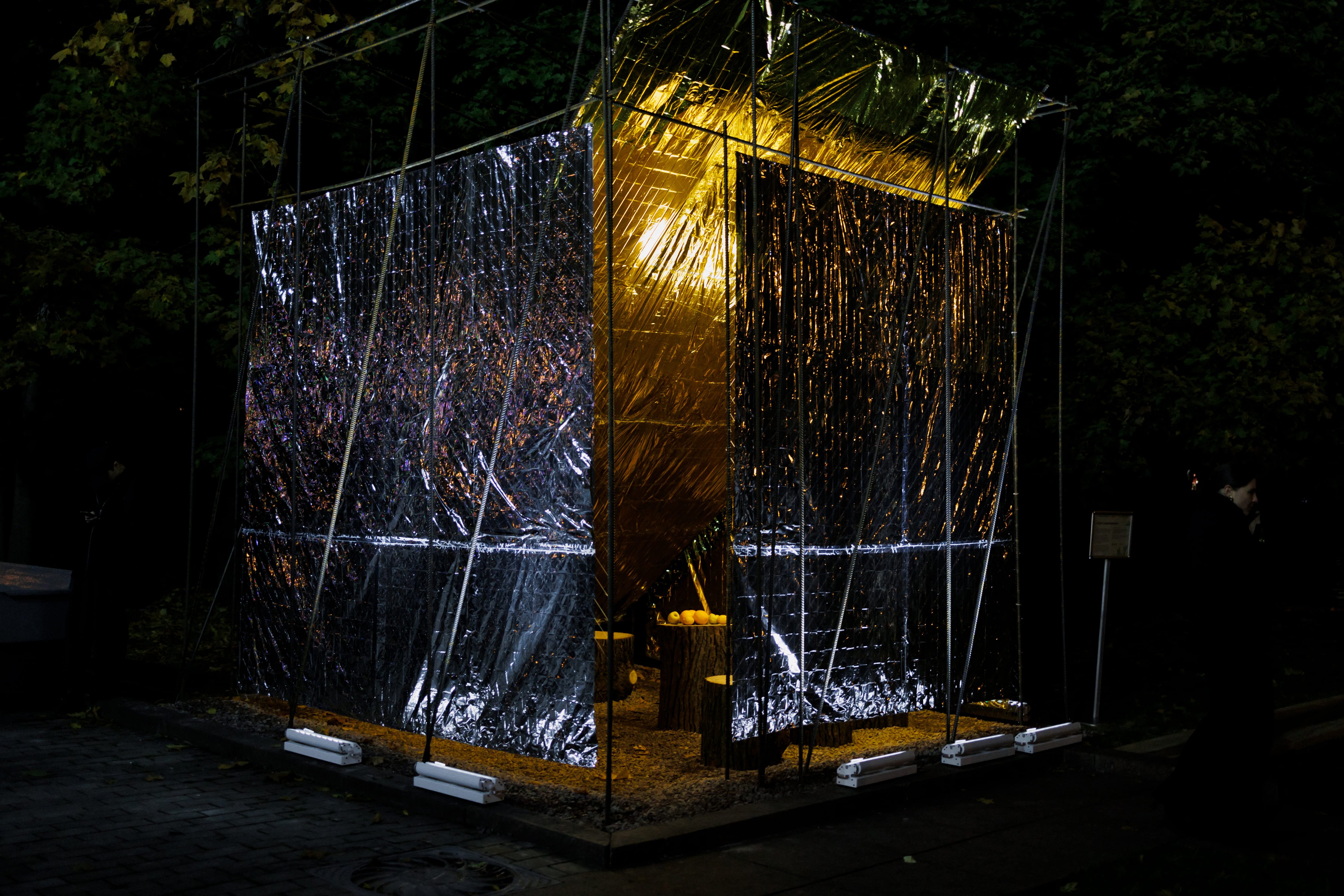 «Три с половиной» (Владимир Изаксон). Конструкция объекта (именно столько стен в авторском шалаше) была сделана из тончайшего листа золотистой пленки с внутренней стороны и серебристой — с внешней. Выбор такого ненадежного материала автор обусловил идеей полного доверия всевышнему.