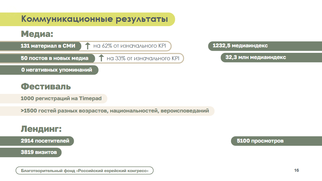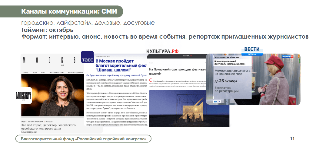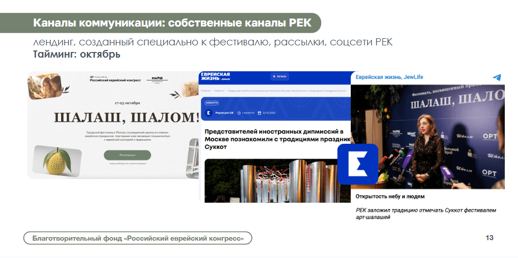 Были четко сформулированы коммуникационные задачи: популяризировать еврейскую культуру среди жителей Москвы и туристов, создать площадку для межкультурного диалога. Еще одной важной задачей стало привлечение средств на обучение детей из малообеспеченных семей в школе «Маалит».